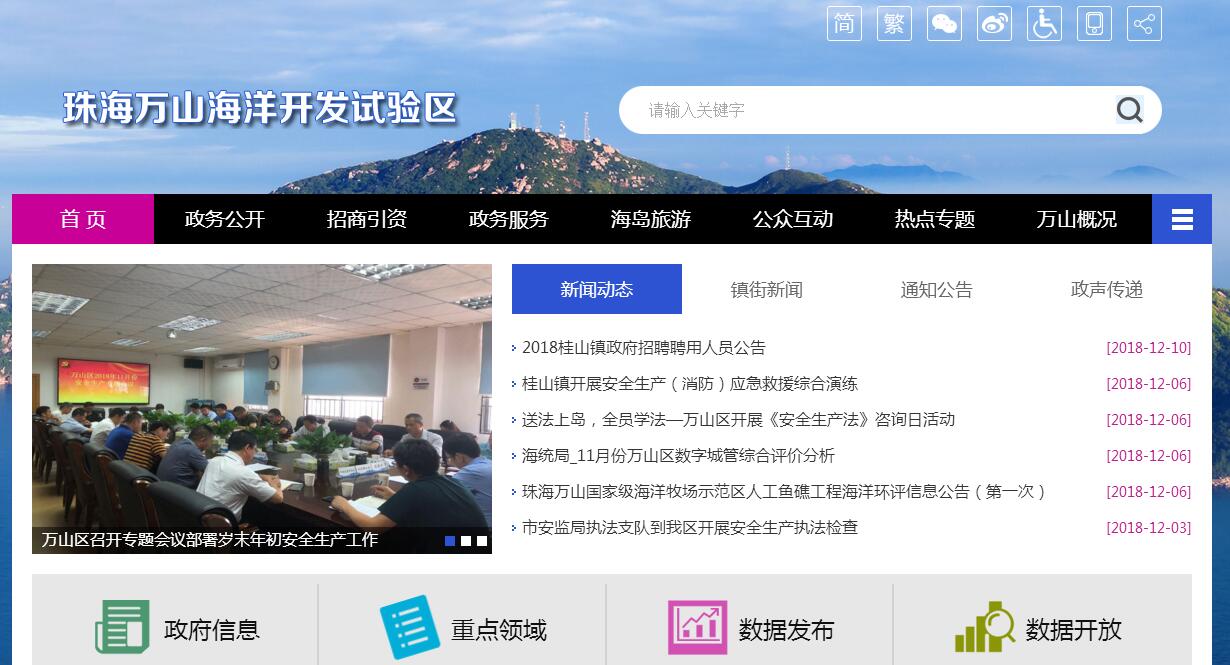 | 网站简介: 珠海万山海洋开发试验区,俗称“万山区”,于1998年9月经广东省人民政府批准设立,是中国第一个地方性海洋综合开发试验区,中共广东省委员会、广东省政府明确赋予其行使地级市经济管理权限。地处珠江入海口,东邻香港,西接澳门,辖桂山镇、担杆镇、万山镇3个建制镇7个行政村及东澳旅游综合开发试验区,试验区常住人口7348人,其中户籍人口3022人。拥有大小岛屿106个,所辖海岛陆地面积80多平方公里,海域面积3200平方公里,是珠江三角洲乃至华南腹地出入南海,通向世界的咽喉要道。万山区地处珠江入海口,东邻香港,西接澳门,所辖海域面积3200平方公里,中心区域为珠江口国际锚地,有大西、大濠等6条国际著名水道纵横期间,是珠江三角洲乃至华南腹地出入南海,通向世界的咽喉要道,自古以来是军事战略要地,海岛驻有部队以及海关、边检、检验检疫和海事等口岸联检单位,2003年开通的万山口岸是国家一类客货运口岸。 |