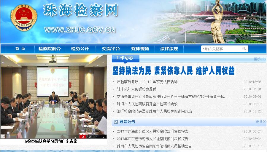 珠海市位于南海之滨,广东省西南部,因处于珠江注入南海之处而得名,东与香港、深圳隔海相望,南与澳门相连,西邻江门,北与中山市接壤。珠海依山临海,环境优美,素有“百岛之市”美誉,曾先后荣获联合国人居中心颁发的“改善人类居住环境最佳范例奖”和国家有关部门授予的“国家环境保护模范城”、“中国旅游胜地40佳”、“中国精神文明建设十佳城市”、“中国十大最具幸福感城市”等称号。珠海市人民检察院坐落于珠海市香洲区。1955年12月1日,珠海县人民检察院正式成立,隶属于广东省人民检察院佛山地区分院,院址设在珠海县唐家镇。 1958年并入中山县人民检察院。1961年恢复珠海县人民检察院,1967年因文化大革命而被撤销,1978年恢复重建。1979年3月5日,根据国务院的有关批文,珠海市人民检察院(县级)正式成立,内设七个科室,院址设在香洲区康宁路33号8号楼。1979年11月26日,珠海市由原属广东省和佛山 地区双重领导改为直属广东省领导,成为地区一级的省辖市。珠海市人民检察院因此升格为地市级检察院。1985年初,珠海市人民检察院迁入光明街97号。 1999年2月8日,迁至现址至香洲区香华路166号。截至2018年6月,珠海市人民检察院下辖香洲、金湾、斗门3个基层检察院以及横琴新区检察院、高新区知识产权检察室、派驻高栏港经济区检察室等3个派出机构,设政治处1个职能机构和15个内设机构、1个直属机构及1个事业单位,共有工作人员227人,其中政法专项编制公务员156人,职工17人,事业编制2人,职员36人,合同制司法辅助人员16人。