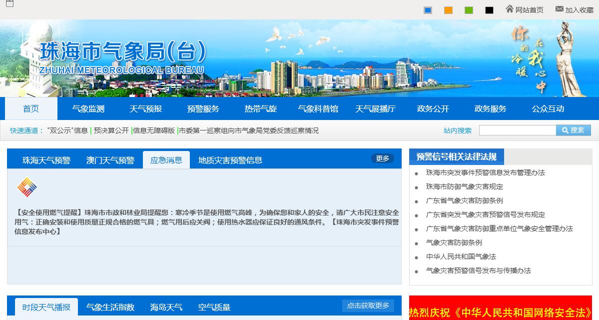根据事业单位分类改革精神,珠海市气象局(台)是市政府管理的事业单位,公益一类,正处级建制。其主要职责:一、贯彻执行国家有关气象工作的法律、法规、规章和政策,起草有关法规规章,拟订气象事业发展规划、气象灾害防御规划及有关政策,经批准后组织实施。二、负责气象行业管理,依法保护气象探测环境,管理本行政区域内的涉外气象活动,指导、监督各类气象活动。三、负责气象资料共享的管理工作,组织管理气象探测资料的汇总、分发和交换;负责重要气象设施建设项目的技术审查和气象设备计量检查;负责气象探测网的规划、新探测设备引进等管理。四、负责管理气象灾害防御工作,承担决策气象服务以及重大灾害天气跨地区、跨部门的联防监测、预报工作;组织气象灾害风险评价和灾害成因界定工作;参与应对气候变化工作。五、管理公益性气象预报、灾害性天气警报等公共气象服务,承担应急气象保障服务工作,管理气象信息发布。六、负责气候资源的管理和利用工作,为市政府应对气候变化工作提供科学技术支撑;负责对城市规划、国家重点建设项目、重大区域性经济开发项目和大型气候资源开发利用项目进行气候可行性论证。七、负责发布公益性气象信息、天气预报产品的分析和制作、灾害性天气警报、气象灾害预警信号和城市环境气象预报、火险气象预报等专项预报。八、负责制订人工影响局部天气作业方案,管理、指导和组织实施人工影响局部天气作业。九、负责升放气球管理工作,组织管理雷电灾害防御工作以及对建筑物、构建物和其他防雷设施建设进行设计审核、工程验收工作。十、组织宣传、普及气象科学知识,提高气象防灾减灾和气候资源意识;开展气象科技合作与交流工作。十一、监督有关气象法规的实施,依法查处违反气象法规的行为。十二、承办市委、市政府和上级部门交办的其他事项。