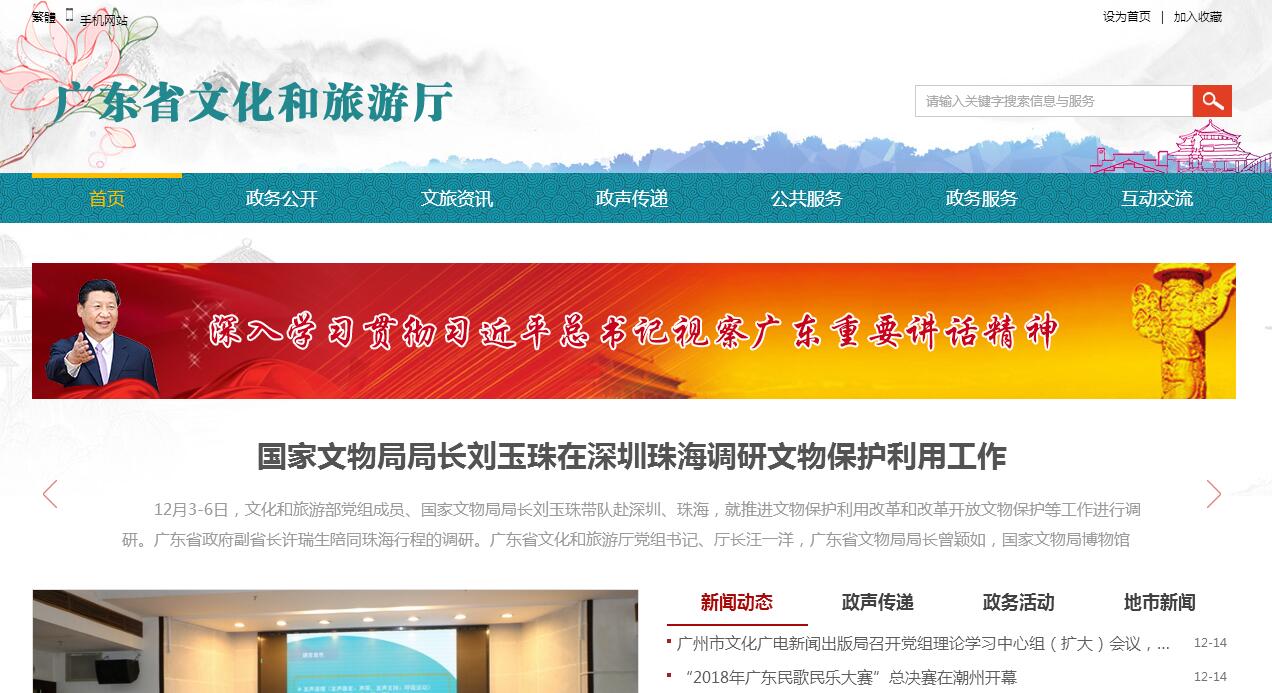 广东省文化和旅游厅,是广东省政府机构改革后新组建的部门。2018年10月25日,广东省文化和旅游厅正式挂牌成立,同时加挂广东省文物局牌子。其主要职责:(一)贯彻执行中央和省关于文化艺术工作的方针政策和法律法规,起草有关地方性法规、规章草案,拟订全省文化事业和文化产业发展规划并组织实施。(二)管理文化艺术事业,协调、指导艺术创作和生产,扶持代表性、示范性、实验性文化艺术品种,推动各门类艺术的发展,管理全省性重大文化活动。(三)推进文化艺术领域的公共文化服务,引导公共文化产品生产,指导省重点文化设施建设和基层文化设施建设。(四)指导文化市场综合执法,负责对文化经营活动进行行业监管,对从事演艺活动的民办机构进行监管。(五)促进全省文化产业发展繁荣,协调指导动漫和网络游戏相关产业规划、产业基地、项目建设、会展交易和市场监管,负责文艺类产品网上传播的前置审批工作,按分工管理网吧等上网服务营业场所,监管网络游戏服务。(六)指导、管理社会文化事业,指导图书馆、文化馆(站)事业和基层文化建设。(七)组织协调文化遗产的管理和保护,指导和管理文物、博物馆事业,组织实施非物质文化遗产保护和优秀民族文化的传承普及工作,指导、协调全省世界文化遗产项目的申报和中国世界文化遗产地的管理工作。(八)指导、管理文化方面的对外交流与合作。(九)指导文化艺术、文化科研工作和文化艺术教育工作。(十)承办省委、省政府和文化部交办的其他事项。