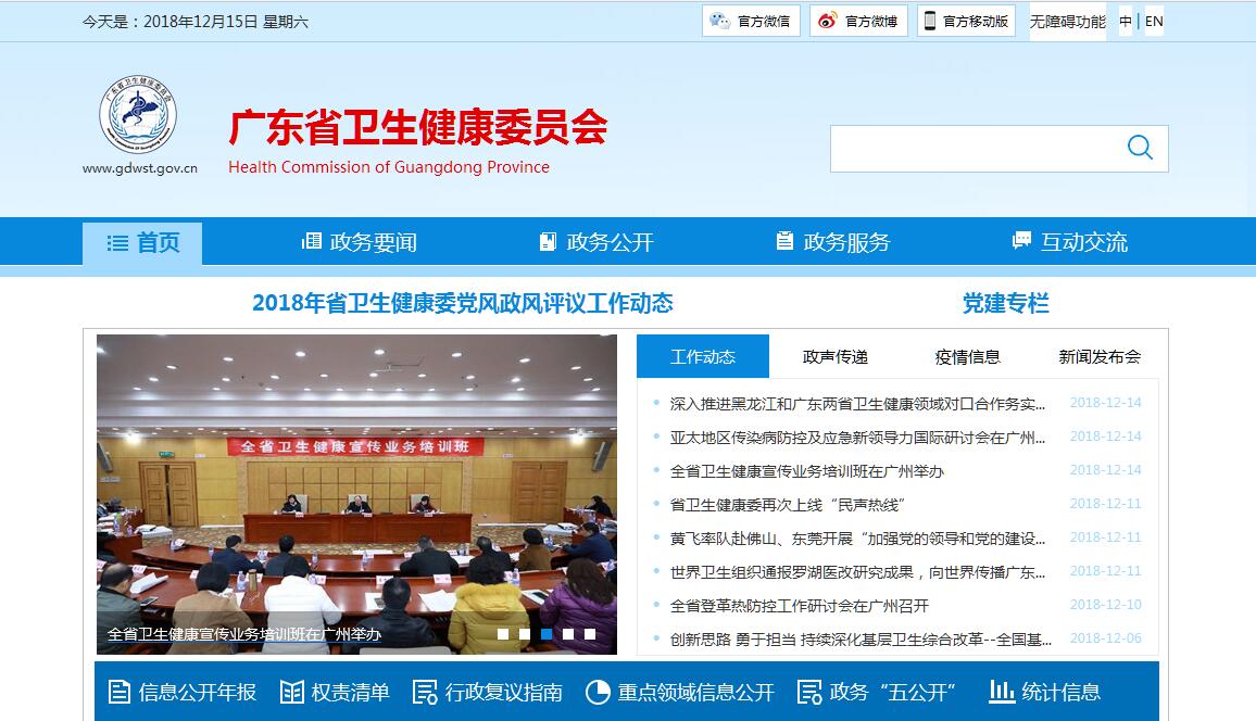 广东省卫生健康委员会,是广东省政府机构改革后新组建的部门。根据党中央、国务院批准的《广东省机构改革方案》,广东牢固树立“四个意识”,坚定“四个自信”,把推进机构改革作为“两个坚决维护”的政治要求和具体行动,切实抓好方案的组织实施,确保改革不走样、不跑偏。2018年10月26日,广东省卫生健康委员会挂牌。副省长张光军出席挂牌仪式。广东省卫生健康委员会公众网是广东省卫生健康委员会唯一通过国际互联网对外发布卫生健康信息和提供服务的正式网站。2001年,广东省卫生健康委员会为适应新形势下加强卫生健康工作的需要,在中国互联网信息中心注册了广东卫生健康委公众网站,通过互联网开展对外宣传,提供公众服务,收到了良好的社会效果。随着政务公开和政务规范化建设的深入开展,人民群众对卫健机关的管理和服务职能提出了更高的要求。为了利用网站这个平台努力为群众提供更多更好的服务,广东省卫生健康委员会领导亲自动员和部署,不断加大网站在人、财、物方面的投入,网站不断向前发展。2002年为了进一步规范卫生健康委公众网站的建设,制定了《广东省卫生健康委员会公众网站管理暂行规定》,并规定了广东省卫生健康委员会公众网站由委办公室负责,协调各业务部门的信息发布并审核把关,网上宣传信息内容的更新,网站建设、规划、维护、保障以及运行管理由委政务服务中心负责。于2003、2004、2005年进行了3次大改版和完善。于2006年全国卫健委/局级网站评比之中排名前三,在2004和2005年由广东省经济和信息化委员会组织省直单位网站评比中名列前茅。2007年4月对卫生健康委公众网站进行了全新改版,从信息采、编、发进行了全新改善,并重新修订了《广东省卫生健康委员会公众网站管理办法》。网站实行统一管理、内容统一审核。加强了网站的互动信息、政务公开等多项功能。5月1日,改版后的网站正式向社会推出。目前,广东省卫生健康委员会网站正加紧进行网站二期建设,通过增加微信、手机版、微博等功能,进一步完善网站的各项信息和服务功能,为各项工作和管理业务上网提供更好的条件,更好地发挥广东省卫生健康委员会网站宣传政务工作、倾听公众意见和服务社会的重要作用,努力创办全国最好的卫生健康门户网站。