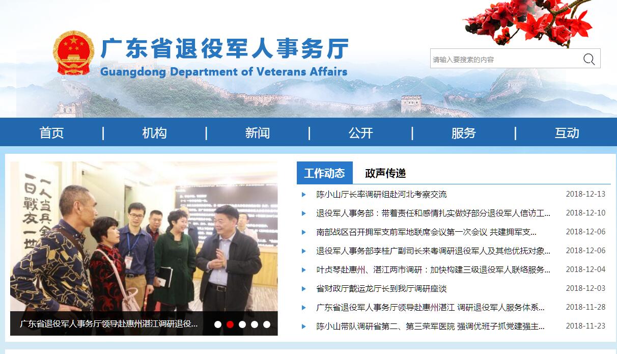| 网站简介: 广东省退役军人事务厅,是广东省政府机构改革后新组建的部门。2018年11月9日上午,广东省退役军人事务厅正式挂牌。省政府副省长叶贞琴、省军区副司令员廖正荣出席挂牌仪式并为省退役军人事务厅揭牌。根据《广东省机构改革方案》,将省民政厅的退役军人优抚安置职责,省人力资源和社会保障厅的军官转业安置职责,以及军队有关职责等整合,组建省退役军人事务厅,作为省政府组成部门。省退役军人事务厅的挂牌成立,标志着我省退役军人事业迈入一个崭新的时代,对维护军人军属合法权益,完善社会治理体系,推进军民融合深度发展,吸引优秀人才投身国防军队建设,汇聚实现强军梦、强国梦的磅礴力量具有重大意义。改革后,省退役军人事务厅将承担退役军人思想政治、权益维护、移交安置、就业创业、军休服务管理、拥军优抚、褒扬纪念等职责,构建集中统一、职责清晰的退役军人管理保障机制。 |