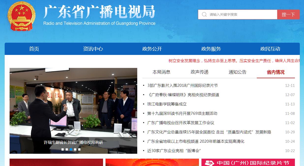 广东省广播电视局主要职责:(一)贯彻执行国家和省有关新闻出版广播影视宣传和著作权管理的方针政策和法律法规,把握正确的舆论导向和创作导向。负责起草新闻出版广播影视和著作权管理的地方性法规、规章草案,制定部门规范性文件、政策、标准并组织实施和监督检查。(二)负责制定全省新闻出版广播影视领域事业发展政策和规划并组织实施,组织实施有关重大公益工程和公益活动,扶助欠发达地区新闻出版广播影视建设和发展。负责制定全省古籍整理出版规划并组织实施。(三)负责统筹规划全省新闻出版广播影视产业发展,制定发展规划、产业政策并组织实施,推进全省新闻出版广播影视领域的体制机制改革。依法负责新闻出版广播影视及版权统计工作。(四)负责监督管理新闻出版广播影视机构和业务以及出版物、广播影视节目的内容和质量,实施行政审批并承担相应责任,负责市场经营活动监督管理相关工作,指导监管广播电视广告播放。负责全省新闻记者证的监制管理。(五)负责对互联网出版和开办手机书刊、手机文学业务等数字出版内容和活动进行监管。负责对网络视听节目、公共视听载体播放的广播影视节目进行监管,审查其内容和质量。(六)负责推进新闻出版广播影视与科技融合,依法拟订全省新闻出版广播影视科技发展规划、政策和相关标准,并组织实施和监督检查。负责对广播电视节目传输覆盖、监测和安全播出进行监管,推进广电网与电信网、互联网三网融合,推进应急广播建设。负责指导、协调新闻出版广播影视系统安全保卫工作。(七)负责印刷、复制业的监督管理。(八)负责出版物的进口管理和广播影视节目的进口、收录管理,协调推动全省新闻出版广播影视及版权领域“走出去”工作。负责新闻出版广播影视和著作权管理领域对外及对港澳台的交流与合作。(九)负责著作权管理和公共服务,协同查处有重大影响或跨区域及涉外的著作权侵权盗版案件。 (十)负责组织、指导、协调全省“扫黄打非”工作,组织查处大案要案,承担省“扫黄打非”领导小组日常工作。(十一)指导、协调和管理有关全省重要媒体的宣传、发展、传输覆盖等重大事项。(十二)承办省委、省政府和国家新闻出版广电总局交办的其他事项。