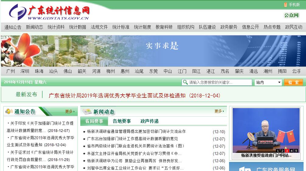 广东省统计局为省人民政府直属机构。其主要职责是:(一)贯彻执行国家和省有关统计工作的方针政策、方法制度和法律法规,起草有关地方性法规、规章草案,拟订统计工作规划和调查计划并组织实施;承担组织和协调全省统计工作,确保统计数据真实、准确、及时的责任;监督检查统计法律、法规和制度的实施,指导全省统计工作。(二)拟订地方统计报表制度,组织实施全省及各地区国民经济核算制度和投入产出调查,核算全省及各地区生产总值,汇编提供国民经济核算资料,监督管理全省各地区国民经济核算工作。(三)会同有关部门拟订重大省情省力普查计划、方案,组织实施全省人口、经济、农业等重大省情省力普查,汇总、整理和提供有关省情省力方面的统计数据。(四)组织实施农林牧渔业、工业、建筑业、批发和零售业、住宿和餐饮业、房地产业等统计调查,收集、汇总、整理和提供有关调查的统计数据,综合整理和提供地质勘查、旅游、对外经济、交通运输、邮政、教育、卫生、社会保障、公用事业等全省性基本统计数据。(五)组织实施能源、投资、科技、人口、劳动力、社会发展基本情况等统计调查,收集、汇总、整理和提供有关调查的统计数据。(六)组织全省各地区、各部门的经济、社会、科技和资源环境统计调查,统一核定、管理、公布全省性基本统计资料,定期发布全省国民经济和社会发展情况的统计信息,组织建立服务业统计信息共享和发布制度。(七)对国民经济、社会发展等情况进行统计分析、统计预测和统计监督,向省委、省政府及有关部门提供统计信息和咨询建议。(八)依法审批或者备案全省各地区、各部门统计调查项目,指导专业统计基础工作、统计基层业务基础建设,组织建立服务业统计信息管理制度,建立健全统计数据质量审核、监控和评估制度,开展对重要统计数据的审核、监控和评估,依法监督管理全省涉外调查活动。(九)协助管理地级以上市统计局局长和副局长,指导全省统计专业技术队伍建设,会同有关部门组织管理全省统计专业技术资格考试、职务评聘、从业资格认定工作,会同有关部门监督管理全省县级以上政府统计部门由中央、省级财政提供的统计经费和专项基本建设投资。(十)建立并管理全省统计信息化系统和统计数据库系统,指导各地区、各部门统计数据库和网络的基本标准和运行规则的实施工作,指导全省统计信息化系统建设。(十一)承办省人民政府和国家统计局交办的其他事项。
