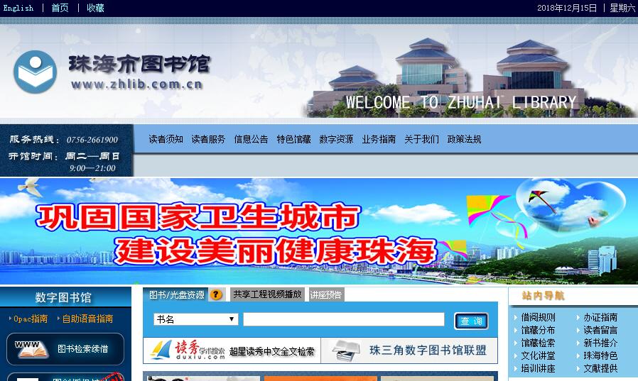 珠海市图书馆位于新香洲迎宾北路,占地面积30000平方米,建筑面积16000平方米。整体建筑集古典与现代于一体,环境优美,造型独特,富有地方特色,是一座与珠海历史文化相呼应、内部功能现代化的公益性大型标志性文化设施。图书馆设计藏书量200万册(件),读者席位1500个,网络信息点位800个。馆内设有中文图书借阅厅、中文报刊阅览室、外文书刊阅览室、新报新刊阅览室、珠海地方文献阅览室、港澳台文献阅览室、古籍阅览室、参考文献阅览室、展览艺术长廊、专家研究室、信息咨询室、自学室等传统服务区,同时设有多功能报告厅、电子阅览厅、音像视听室、培训室、演示厅等自动化服务区,是一座集信息化、智能化、多功能于一体的现代化图书馆。宽敞明亮的大堂,安静舒适的阅读室,丰富繁多的图书种类,功能齐全的设施,为方便读者和完善图书馆服务功能,还设立了购书中心、商务中心、书吧、餐厅等配套服务设施,为读者营造休闲、舒适、温馨的良好学习环境。珠海市图书馆是我市“三个文明”建设的重要窗口,它以崭新的姿态,以多角度、全方位的方式为广大读者提供高质量、高水平的信息资源服务,成为全市的知识资源集散中心、市民终身学习教育和文化休闲的理想场所。