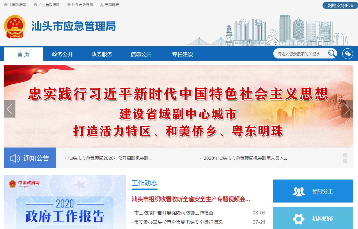 汕头市应急管理局主要职责:(一)负责应急管理工作,指导全市各区(县)、各部门应对安全生产类、自然灾害类等突发事件和综合防灾减灾救灾工作。负责安全生产综合监督管理和工矿商贸行业安全生产监督管理工作。(二)拟订应急管理、安全生产等政策,组织编制市应急体系建设、安全生产和综合防灾减灾规划,拟订相关地方性法规、规章草案、规程和标准并组织实施。(三)统筹全市应急预案体系建设,建立完善事故灾难和自然灾害分级应对制度,综合协调应急预案衔接工作,组织编制市总体应急预案和安全生产类、自然灾害类专项预案,组织开展预案演练,推动应急避难设施建设。(四)牵头建立统一的应急管理信息系统,负责信息传输和共享,建立监测预警和灾情报告制度,健全自然灾害信息资源获取和共享机制,依法统一发布灾情。(五)组织指导应对突发事件工作,组织指导协调安全生产类、自然灾害类等突发事件应急救援,综合研判突发事件发展态势并提出应对建议,协助市委、市政府指定的负责同志组织较大灾害应急处置工作。(六)统一指挥协调全市各类应急专业队伍,建立应急协调联动机制,推进指挥平台对接,提请衔接解放军和武警部队参与应急救援工作。(七)统筹应急救援力量建设,负责森林火灾扑救、抗洪抢险、地震和地质灾害救援、生产安全事故救援等专业应急救援力量建设,指导区(县)和社会应急救援力量建设,协调综合性应急救援队伍建设。(八)负责消防管理工作,指导消防监督、火灾预防、火灾扑救等工作。(九)指导协调相关部门森林火灾、水旱灾害、冰冻、台风、地震和地质灾害等防治工作,负责自然灾害综合监测预警工作,指导开展自然灾害综合风险评估工作。(十)组织协调灾害救助工作,组织指导灾情核查、损失评估、救灾捐赠工作,按权限管理、分配救灾款物并监督使用。(十一)依法行使安全生产综合监督管理职权,指导协调、监督检查市政府有关部门和各级政府安全生产工作,创新和加强安全生产综合监管。(十二)按照分级、属地原则,依法监督检查工矿商贸生产经营单位贯彻执行安全生产法律法规情况及其安全生产条件和有关设备(特种设备除外)、材料、劳动防护用品的安全生产管理工作。依法组织并指导监督实施安全生产准入制度。负责危险化学品安全监督管理综合工作和烟花爆竹经营企业安全生产监督管理工作。(十三)依法组织指导生产安全事故调查处理,监督事故查处和责任追究落实情况。组织开展自然灾害类突发事件的调查评估工作。(十四)开展应急管理方面的交流与合作,组织参与安全生产类、自然灾害类等突发事件的跨区域救援工作。(十五)制定应急物资储备和应急救援装备规划并组织实施,牵头建立健全应急物资信息平台和调拨制度,在救灾时统一调度。(十六)负责应急管理、安全生产宣传教育和培训工作,组织指导应急管理、安全生产的科学技术研究、推广应用和信息化建设工作。(十七)完成市委、市政府和省应急管理厅交办的其他任务。