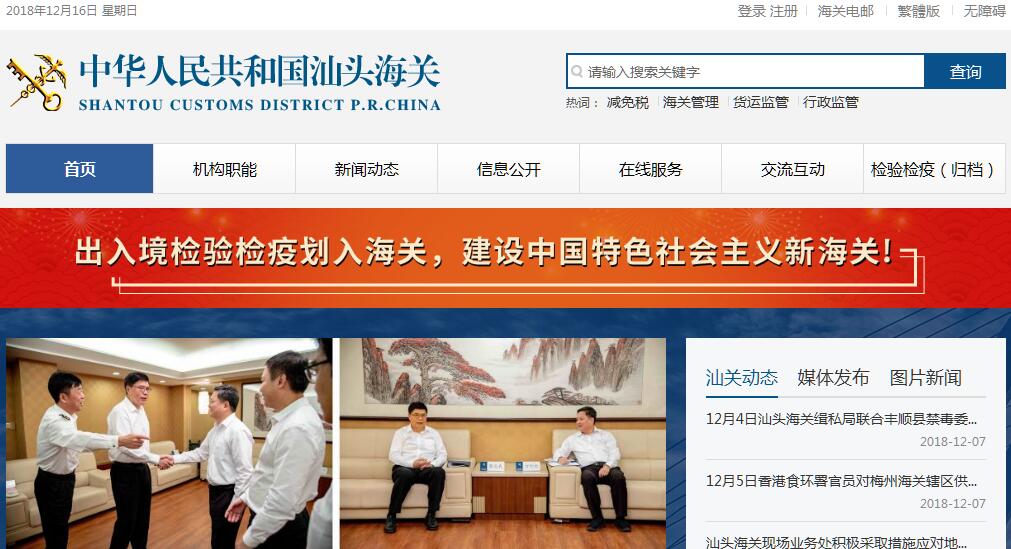 | 网站简介: 汕头海关的前身潮海关始建于1860年,是近代中国继“江海关”、“粤海关”之后设立的第3个实行外籍税务司制度的海关,至今已有155年的历史。关区覆盖包括汕头、梅州、汕尾、潮州、揭阳等5个地级市及所属28个县(市、区),面积约3.1万平方公里,人口2000多万。陆地海岸线长1215公里。关区内有一类口岸7个(其中水运口岸5个,空港口岸2个),二类海运口岸4个,陆运货检场14个,对台小额贸易口岸7个。关区东接厦、漳、 泉经济圈,西邻珠三角经济发达地区,毗邻港、澳、台和国际主航道。我关为正厅级机构,现有副厅级机构1个,正处级机构 53个,副处级机构1个。 |