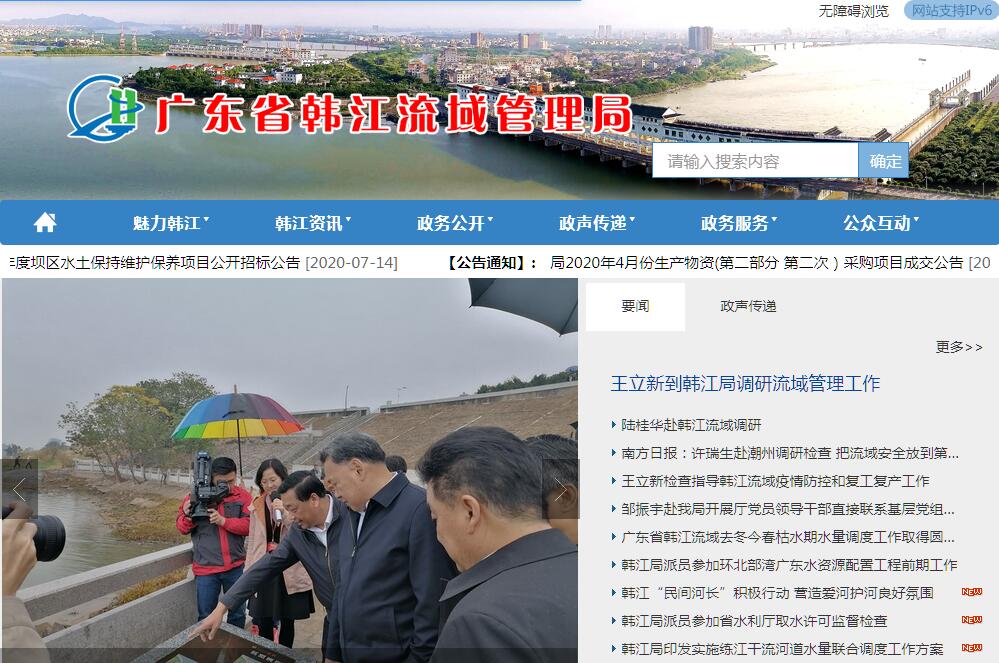 | 网站简介: 广东省韩江流域管理局主要职责:一、承担韩江流域全面推行河长制的具体事务性工作;二、承担韩江流域综合规划和流域水资源保护、治涝、供水等与水利有关的专业规划编制并组织实施;三、组织韩江流域相关科研项目研究;四、承担制订韩江流域水量分配方案、流域年度水量调度计划、流域内跨地级以上市及流域外调水的水量分配方案工作并组织实施;五、协调流域、区域和行业之间的水事关系;六、参与核定韩江干流及其三角洲河道和其他河道水域的纳污能力,对水功能区的水质状况进行监测;七、承担对韩江流域水资源、防洪、水土保持、河道(含采砂)等有关法律法规的执行情况实施日常巡查;八、承担韩江流域内行政区域的“三防”工作巡察、指导,建设流域防洪监测及预警响应机制相关具体工作;九、管理潮州供水枢纽管理中心;十、承担韩江粤东灌区运行管理相关工作;十一、承担省流域管理委员会和省水利厅交办的其他事项。 |