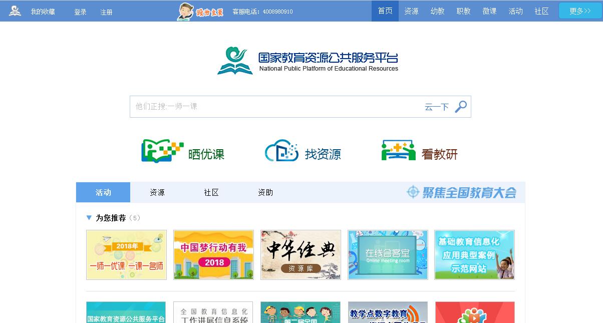 “国家教育资源公共服务平台”是中央政府提供教育基本公共服务的一次创新。 教育部副部长杜占元在开通仪式上指出,国家教育资源公共服务平台在提供资源上传下载服务的基础上,强调以学习空间为核心的资源推送,把不同用户所需要的资源送入不同的个人空间,以教师的教学空间应用带动学生、家长和学校的应用,在“宽带网络校校通”的基础上,促进“优质资源班班通“和”网络学习空间人人通”。国家教育资源公共服务平台充分依托现有公共基础设施,利用云计算等技术,逐步推动与区域教育资源平台和企业资源服务平台的互联互通,共同服务于各级各类教育,为资源提供者和资源使用者搭建的起网络交流、共享和应用环境。将国内教育优势地区的名校、名师资源集中起来,为全国师生提供个性化的空间和服务。促进“优质资源班班通”和“网络学习空间人人通”,让优质资源和创新应用惠及人人。自2012年12月28日开通试运行开始,中央电化教育馆网络部承担平台从V1.0到V2.0的运行维护工作。并建立了平台的门户网站,设立新闻、资源、活动、培训、导航、发现等网站频道,着力于教育信息化的工作进展、教育资源的推送推广、各类教育活动的举办实施、教育资源信息的智能导航。并开通了客服400服务呼叫中心,设立实时监控,加固及加速网络服务设施,努力更好的为广大网络用户提供优质的服务。