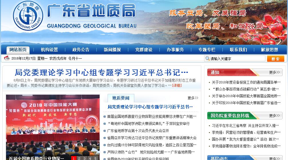 广东省地质局成立于1956年10月,由当时的中南地质局所属广东省境内地质队伍组建地质部广东省地质局,1958年5月改为省部双重领导的广东省地质局,文革期间曾多次改变名称和管理体制,1978年12月复名为广东省地质局;1983年10月改称广东省地质矿产局,简称省地矿局;1995年9月由省地矿局分为广东省地质矿产局和广东省地质矿产勘查开发局,“一套机构、两块牌子、分职能运转”,即省地质矿产局负责地矿行政管理职能,而地质矿产勘查开发局管理所属地勘队伍;1999年6月后实行属地化管理,省地质矿产局的行政业务职能处室与省国土厅合并,组建广东省国土资源厅,负责地矿行政管理职能,广东省地质矿产勘查开发局更名为广东省地质勘查局,2009年再次复名为广东省地质局,为省政府直属正厅级行政类事业单位。局机关参照公务员管理,设11个职能处室和1个省地质工会,下属单位40个,干部职工16000多人,是一支具有光荣历史和优良传统的队伍,是广东经济社会发展的地质工作主力军。广东省地质局广大地质工作者发扬艰苦奋斗、无私奉献精神,五十多年来在广东开展了大量的基础性、公益性地质工作:先后完成了全省陆地1:20万区域地质、矿产、水文地质和物化探等调查任务,开展了1:5万—1:20万各种比例尺区调工作,完成全省大中城市及经济开发区的综合地质调查,为缺水地区和城市找到地下水源和一批地热资源等。在地质找矿方面:在广东省找到的各类矿产储量的潜在经济价值超过20000亿元以上,著名的云浮硫铁矿、大宝山多金属矿、凡口铅锌矿、河台金矿、茂名油页岩、仁化铀矿、揭阳稀土矿、石碌铜矿等一大批矿山更是闻名全国乃至全世界,使我省拥有“中国硫都”、“黄金之乡”、“稀土之乡”、“有色金属之乡”等美誉。广东省地质局是从事地质勘查业务的专业局。全局专业技术人员比例高,人才济济。全局下属专业队伍分布于全省各大中城市,近年承担和组织开展了农业地质、城市地质、地质灾害防治等一大批国家、省级公益性地质任务;全局拥有矿产资源勘查、地质灾害防治、工程勘查设计、施工,岩土工程勘察、施工等资质证书,近年来主要完成的工程项目包括:大亚湾核电站选址、广州地铁线路勘察选线、黄沙过江隧道工程选点、广深高速公路、虎门大桥、中信广场(80层)、广州市民广场、东深供水改造工程、广州新国际机场、广州大学城、京珠高速公路、武广客运专线、南海壳牌石化等一批重点工程和港口、码头、高层建筑的工程勘察、地质灾害调查与防治及地基基础建设施工,是广东省地质灾害勘查治理和工程勘察施工的主力军。广东省地质局围绕广东科学发展大局,主动融入经济社会发展,坚持“服务立局”,实现“有为有位”,拓宽地质工作服务领域,增强地质工作服务功能,发挥了资源基础、环境基础和工程建设基础的作用,为广东省构建保障和促进科学发展的体制机制,为经济社会发展做出了积极贡献。广东省地质局的主要职责:(一)贯彻执行国家和省有关地质矿产资源勘查、开发与环境地质工作的法律法规和方针政策。(二)组织所属地勘单位实施全省基础性、公益性、战略性地质调查、矿产资源勘查工作,向国家和省国土资源部门汇交地质勘查、科研成果及有关地质资料,承担地质资料的保密责任;向社会提供公益服务。(三)受委托负责组织实施全省地质灾害调查评价、监测和防治工作,组织所属地勘单位承担水文地质、环境地质、工程地质勘查和评价工作,参与地质灾害应急抢险工作。(四)开展前沿性、基础性地质科学研究;开展地质调查和矿产勘查等相关新技术、新方法、新工艺的应用研究、引进与推广。(五)受省国土资源厅委托,组织实施全省地质勘查规划,承担拟定地质调查和矿产勘查技术规程、规范和标准等工作。(六)负责本局地质调查、矿产勘查与开发、工程地质勘察与施工的技术与质量管理;对所属单位安全生产和生产经营活动进行指导和检查监督。(七)开展与地质调查和矿产勘查相关的国际交流合作;组织所属单位开拓国(境)外地质工作,为国家和省经济发展提供矿产资源保障。(八)负责本局国有资产和国家、省下达给该局的地质调查、勘查经费和地质勘查基金的管理、使用和监控。(九)管理所属单位,推进地质勘查管理体制改革。(十)承办省人民政府和上级交办的其它事项。