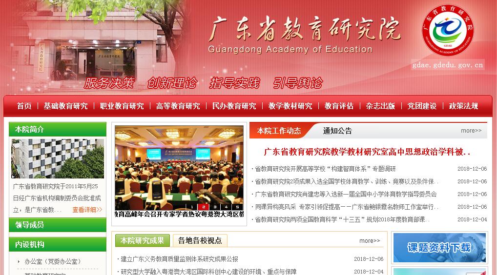 广东省教育研究院于2011年5月25日经广东省机构编制委员会批准设立,是广东省教育厅管理的事业单位,公益一类,副厅级。核定事业编制95名。(一)作用定位。1.围绕省教育厅中心工作,以服务教育决策、创新教育理论、指导教育实践、引导教育舆论为基本职能定位,加强教育战略研究、政策研究、理论研究和实践研究,为省委、省政府及省教育厅相关决策和管理提供重要智力支持,为打造南方先进教育思想理论形成与实践高地作出重要贡献。2.工作成果用于省委、省政府及省教育厅的教育科学决策和管理,用于促进各市、县(市、区)党委、政府及教育行政部门提高教育科学决策和管理水平,用于指导各级各类学校提高教育教学质量和办学水平,服务于增强我省教育综合实力、区域竞争力和国际影响力的需要。3.加强与省内外和国内外教育行政部门、教育研究机构、学校的交流与合作,丰富和发展教育研究资源,宣传和推广教育研究成果,为国家、为省深化教育综合改革、推动教育科学发展发挥重要作用。(二)主要任务。1.开展全省教育改革和发展的战略研究、政策研究,为省委省政府相关决策提供咨询服务。2.追踪和分析教育重点、热点和难点问题,为促进教育决策科学化提供智力支持。3.协助省教育厅制订全省教育发展研究规划,参与制订教育评估政策。4.承担全省基础教育、职业教育教学研究工作;承担基础教育、职业教育课程的研究、建设和指导工作;指导、组织中小学和职业教育教材编写工作;开展课程、教材、教法改革实验;提出中小学教学用书目录。5.协助省教育厅组织有关教育、科研评估(评审)工作,参与教育质量监测工作。6.承担国家级和省部级重大教育科研项目研究。7.承担省教育厅党组交办的有关工作。