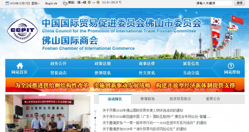 中国国际贸易促进委员会佛山市委员会(简称佛山市贸促会)是由佛山市经济贸易界有代表性的人士、企业和团体组成的全市民间对外经贸组织,于1986年8月成立。英文名称为:China Council for the Promotion of International Trade Foshan Committee,英文缩写为:CCPIT Foshan。1988年根据中国贸促会的通知,同时使用佛山国际商会名称。英文名称为:Foshan Chamber of International Commerce,英文缩写为:CCOIC Foshan。 佛山市贸促会(佛山国际商会)是佛山市人民政府设立的公共服务机构,遵守国家的法律、法规、政策和中国贸促会章程,参照国际惯例,以促进国际投资、贸易和合作,促进佛山经济提高国际竞争力为宗旨,增进佛山市同世界各国、各地区之间的贸易和经济关系的发展,增进彼此之间的相互了解与友谊。 佛山市贸促会(佛山国际商会)设有3个职能部门。其主要职能是:开展我市与外国和港、澳、台地区工商界经贸团体以及有关国际组织的联系工作;邀请和接待外国和港、澳、台地区工商界人士和代表团来访、考察;协助外国和港、澳、台地区对口组织在我市设立的代表机构办理有关手续;承办我市赴外国和港、澳、台地区举办(参加)经贸展(博)览会和参加国际博览会的归口协调及相关的申报工作;承办或协办市内有关单位承接外国和港、澳、台地区来我市举办的经贸及技术展览会、展销会;组织我市经贸、技术合作等团组赴外国和港、澳、台地区访问、考察;开展对口组织的经贸、技术交流合作;经中国贸促会批准或授权,办理经贸纠纷调解业务,签发原产地证明书,出具人力不可抗力证明,代办涉外商贸文件的领事认证业务,代办外国人来华邀请函,认证涉外商业单据,出具国际商事证明书,承担暂准进出口货物单证册(ATA)的出证业务;提供有关法律咨询、顾问、代理等服务;组织企业进行公平贸易申诉和应诉;协助经贸仲裁,调解经贸纠纷,为企业提供有关国际经贸、技术合作、反倾销起诉等方面的法律咨询业务;收集、整理、传递和发布经贸信息;联系、组织经贸洽谈和技术交流活动;向国内外有关企业和机构提供经贸信息、咨询和资信调查等服务;编辑、出版相关刊物、电子出版物等;为企业提供服务;向政府有关部门反映企业界的情况和意见;研究经贸领域的有关问题,向企业提供参考意见;承办企业委托的事宜;举办报告会、研究会及其他各类经贸活动,提供相关的业务培训;指导、督促、检查各区贸促会业务工作。 佛山市贸促会(佛山国际商会)同时是全球最大的国际经贸促进组织之一----中国国际贸易促进委员会(CCPIT)的分支机构。依托中国国际贸易促进委员会强大的国际国内工作网络,自成立以来,根据佛山市人民政府的经济社会发展规划和建设历史文化名城、现代化大都市的需要,不断务实创新,努力开拓进取,在对外交往、经贸促进等方面做了大量而富有成效的工作,取得良好的业绩,与境内外的许多国家和地区的工商企业界建立了广泛的经贸关系和务实合作,拥有近800家的会员企业与合作机构。 为适应全球经济一体化和日新月异的对外经贸发展的新形势,佛山市贸促会(佛山国际商会)将以国际一流贸促机构为榜样,坚持以“创一流贸促业绩、建一流贸促机构、做一流贸促人”的发展目标,与时俱进、开拓创新、追求卓越,以更加优质高效的服务方式,为佛山经济国际竞争力的提高和幸福佛山做出我们应有的贡献。