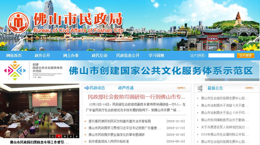 佛山市民政局主要职责:(一)贯彻执行国家、省有关民政工作的法律、法规和方针、政策,草拟规范性文件和民政事业发展规划。(二)负责全市性社团的登记、管理工作;监督社团活动,查处社团组织的违法行为和未经登记擅自以社团名义开展活动的非法组织。(三)负责异地商会的登记、管理工作;负责市直民办非企业单位的登记和管理工作;查处民办非企业单位的违法行为和未经登记的民办非企业单位。(四)组织全市开展双拥活动及承担双拥日常工作;指导全市抚恤优待对象的优抚工作;负责和指导烈士、残疾军人的审核报批工作;指导优抚事业单位和革命烈士纪念建筑物的建设和管理工作。(五)负责军队移交地方管理的离退休干部、退休士官、无军籍退休退职职工、军队落实政策人员和军队复员干部、转业士官、退伍义务兵、残疾军人的接收安置及服务管理工作;指导军休所的建设和管理工作;指导易地安置的地方离退休人员的管理服务工作。(六)组织、协调城乡救灾工作;负责救灾救济捐赠款物的接收、分配、管理;建立和实施城乡居民最低生活保障制度;健全和统筹城乡社会救助体系建设。(七)负责城乡基层政权建设工作;指导村民委员会民主选举、民主决策、民主管理和民主监督工作,推动村务公开和基层民主政治建设;指导城市社区居民委员会建设,制定社区工作、服务管理办法和促进发展的政策措施;负责社区建设协调工作;协调组织基层群众自治组织和社区组织干部的表彰工作。(八)负责地名管理工作;审核地名的命名、更名、销名工作;规范地名标志设置和管理工作。(九)负责行政区划管理工作,负责区、镇(街道)的设立、撤销、调整、更名和区、镇(街道)行政区划界线变更,以及政府驻地迁移的审核报批工作;负责行政区域边界勘定和管理工作;承担边界争议的调处事务。(十)指导全市婚姻登记工作,承办全市涉外婚姻登记工作;倡导婚姻习俗改革;负责收养登记管理工作。(十一)负责殡葬改革和管理工作。(十二)负责老年人、孤儿、弃婴(童)、五保户等特殊困难群体权益保护的行政管理工作,指导残疾人的权益保障工作;负责老龄委员会的日常工作。(十三)负责社会福利工作,指导各类福利设施、福利事业单位、福利机构和城市社区福利服务工作;负责港澳服务提供者以独资民办非企业单位形式举办养老机构、残疾人福利机构的审核工作;指导福利生产企业工作。(十四)负责全市城市生活无着流浪乞讨人员的救助管理工作,指导全市救助管理机构的建设、管理和开展救助管理业务工作。(十五)负责组织实施和指导社会福利彩票发行工作;负责管理、使用、发放福利资金和民政事业费。(十六)会同有关单位按规定拟订全市社会工作发展规划、政策建议;负责全市社会工作的总体发展和实施管理工作。(十七)承办市人民政府和省民政厅交办的其他事项。