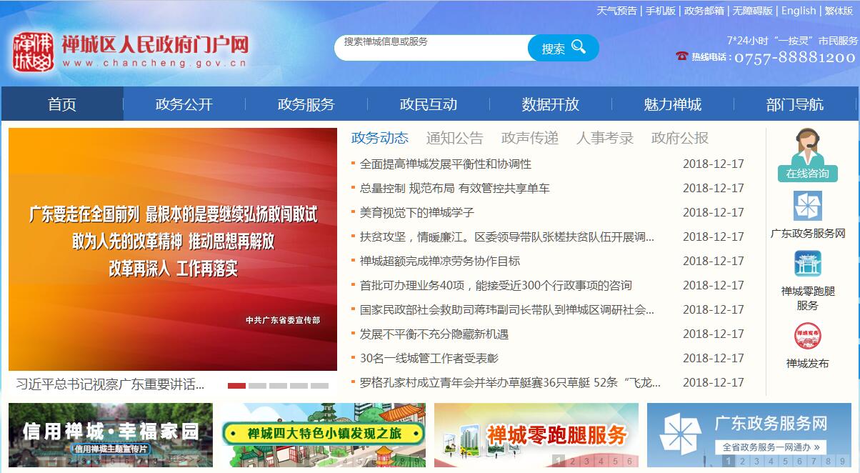 禅城区是佛山市人民政府驻地,佛山市中心城区,是佛山政治、金融、文化、交通和信息中心,面积154.09平方公里,常住人口116万,下辖南庄镇和祖庙、石湾镇、张槎3个街道,145个村(社区)。2003年建区以来,禅城区围绕“首善之区”“创新中心”“幸福家园”的战略定位,全力推进高品质现代化国际化大城市中心城区建设,主动融入广佛同城化、珠三角“半小时”经济圈和粤港澳大湾区建设,初步构建“城产人文”融合的佛山“强中心”格局。位列2017年全国综合实力百强区第18名,全国投资潜力、新型城镇化质量百强区第9名,全国创新创业百强区第17名。社会综合治理云平台荣获“全国社会治安综合治理先进集体”。“一门式一网式”改革荣获“全国创新社会治理最佳案例”,被国务院列为落实重大政策措施,受到2017年国务院大督查实地督查“免督查”的正向激励。禅城区是佛山传统制造业的发源地之一,拥有陶瓷、不锈钢、童装、针织等传统优势行业,智能、节能、健康、高端装备等先进制造业和高技术产业快速发展,现代服务业繁荣活跃。2017年,禅城区实现地区生产总值1750.6亿元,增长8%;三次产业结构为0.03:44.23:55.74。近年来,禅城区积极发展园区经济,建成了佛山古镇文创园、1506创意产业园、泛家居电商产业园、华南创谷、福能大数据产业园等一批特色园区,策划培育了“互联网+”小镇、中国建陶小镇、中国陶谷小镇、岭南风情小镇等一批特色小镇,孕育壮大了电子商务、金融服务、文化创意、研发设计等新业态。石湾西片区正在打造国家级文化产业示范园区,“一谷八园”成为创新创客新载体。奇槎片区国际社区雏形显现,禅西新城是聚集都市型产业和高层次人才的新热土,季华商务带是佛山最具价值商务区和现代服务业集聚区。禅城区历史文化底蕴深厚,是佛山古镇核心区,曾为北宋“四大名镇”和明清“四大聚”之一,全国著名的曲艺之乡、陶瓷艺术之乡、武术之乡、秋色艺术之乡。拥有文物保护单位77处,包括被誉为“东方艺术之宫”的祖庙、清代庄宅式府第建筑群组保存最完整的东华里古建筑群、拥有“500年不灭陶火”的南风古灶等国家级重点文物保护单位。岭南四大名园之首的梁园、黄飞鸿纪念馆、叶问堂、莲峰书院、朱紫街、陶瓷博物馆、南庄水乡等人文和自然景观异彩纷呈。列入非物质文化遗产名录54项,石湾陶塑技艺等9项列入国家级非物质文化遗产名录。粤曲、武术、剪纸、木版年画、南派舞狮舞龙等非物质文化遗产绚丽多彩,行通济、北帝诞、粤剧华光诞、秋色欢乐节、陶艺节等活动源远流长。禅城区集聚全市最优质的教育、医疗、文化资源,是“广东省教育强区”和“广东省推进教育现代化先进区”“全国义务教育发展基本均衡区”、“中国可持续发展教育国家示范区”。