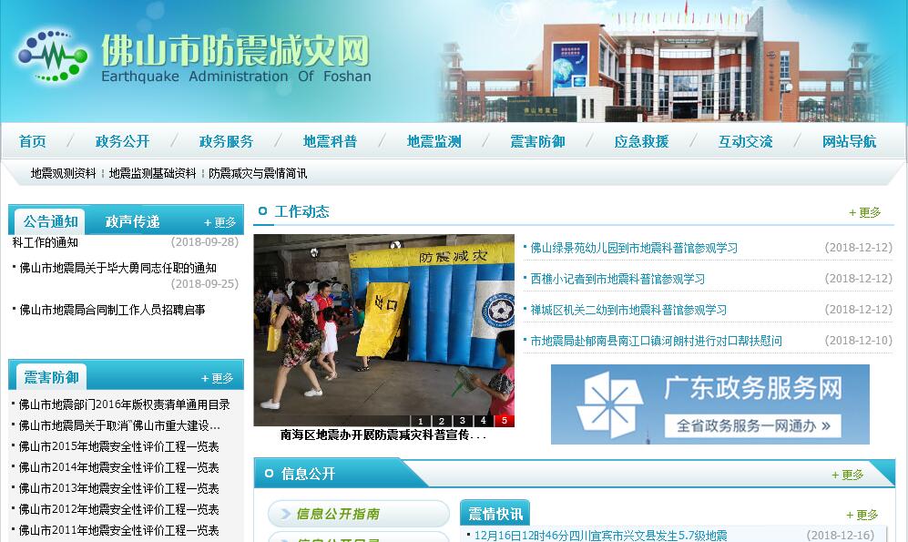 佛山市地震局是行使佛山市政府赋予的防震减灾工作的行政职能部门,主要负责本市地震监测、震害防御、地震应急等工作。地震局的主要职能有:(一)贯彻落实国家和省防震减灾工作的方针、政策和法律、法规;组织起草有关地方性管理规定;会同有关部门编制本行政区域的防震减灾规划;协同有关部门编制城乡总体规划和国土利用规划;编制年度防震减灾工作计划并且组织实施。(二)承担本级政府防震减灾监督管理的责任,依法行使综合监督管理职权,指导协调、监督检查防震减灾工作,查处违法行为;承担我市的地震行政复议、行政诉讼工作。(三)管理地震监测预测和群测群防工作。制定本地区地震监测预测规划;会同有关部门,规定地震观测环境保护范围,对在保护范围内的建设工程进行审核;组织开展震情跟踪、异常核查和群测群防工作。(四)管理本地区地震烈度区划和震害预测工作;负责监督管理本行政区域内建设工程抗震设防要求和地震安全性评价工作;审定地震灾区重建的抗震设防标准,参与灾区重建规划编制工作;保护典型地震遗址、遗迹。(五)指导和监督本地区地震应急工作。会同有关部门编制本行政区域地震应急预案;管理有关单位编制的地震应急预案;监督检查本地区避难场所的设置管理、应急救援队伍的建设等工作;承担市政府抗震救灾指挥机构的日常工作。(六)负责震情速报和地震灾情速报工作;及时收集、保存有关地震的资料和信息,并建设完整的档案。(七)指导、协助、督促有关单位开展防震减灾知识的宣传教育和地震应急救援演练等工作。(八)推进地震科技现代化,组织开展地震科学技术研究、科技成果的推广应用和地震科技工作的合作与交流。(九)管理地方地震台站;指导下级地震工作机构的工作;协助辖区内上级专业地震台站的工作。(十)承办市政府和上级地震管理机构交办的其他事项。