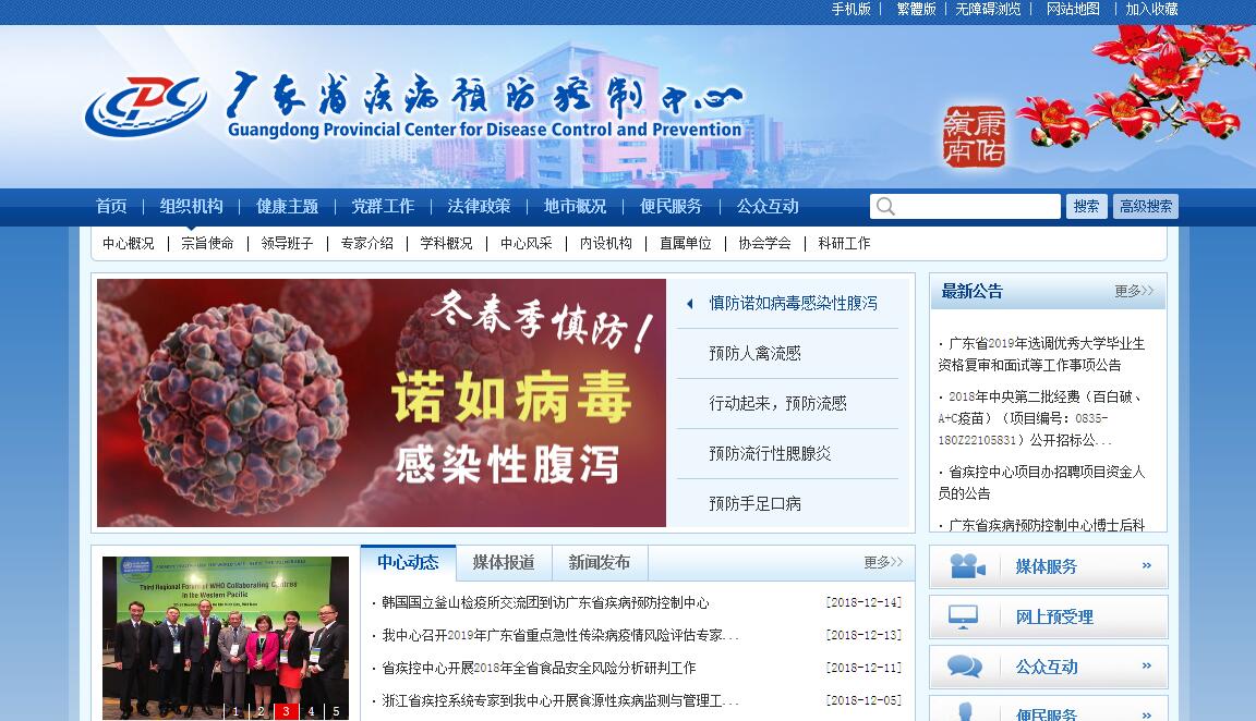 广东省疾病预防控制中心是全省突发公共卫生事件应急处置和疾病预防控制技术指导中心,是隶属于广东省卫生健康委的副厅级公益一类事业单位。它组建于2000年12月28日,前身为成立于1952年的粤穗卫生防疫站。主要负责全省疾病预防与控制、突发公共卫生事件应急处置、疫情报告及健康相关因素信息管理、健康危害因素监测与干预、实验室检测分析与评价、健康教育与健康促进、技术管理与应用研究指导。具体职责如下:(一)贯彻执行国家和省有关疾病预防控制工作的法律法规和政策,组织实施辖区内疾病预防控制规划、计划和方案。(二)开展传染病监测与预测预警,负责预防性生物制品使用管理与效果评价,参与重大预防接种事故调查处置等工作。(三)组织实施公共卫生健康危害因素监测、技术指导、卫生学评价和干预,组织、指导开展重大突发公共卫生事件技术调查、危险性评价等工作。(四)组织开展病原微生物、毒物、污染物检测、检验及相关鉴定工作,承担卫生行政部门委托的与卫生监督执法相关的检测检验、分析评价、技术鉴定等工作。(五)承担全省疾病预防控制机构(含实验室)质量控制、业务指导和相关培训工作,组织实施各市、县(区)疾病预防控制机构业务考核工作,指导辖区内医疗卫生机构传染病防治工作。(六)建设省级疾病预防控制公共卫生信息平台,承担疫情报告及健康相关因素信息管理。(七)承担开展和指导全省疾病预防控制相关健康教育、健康促进和基层公共卫生服务工作。(八)开展疾病预防控制应用性科学研究和指导,推广先进技术和手段,参与拟订国家公共卫生相关标准。(九)完成上级交办的其他任务。