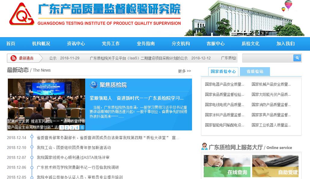 广东产品质量监督检验研究院(简称广东质检院、英文简称GQI),成立于1983年9月,又名国家技术监督局广州电气安全检验所、广东省试验认证研究院,是广东省市场监督管理局(知识产权局)直属的副厅级事业单位。广东质检院是广东省市场监督管理局(知识产权局)属下的法定第三方专门从事产品质量检验和认证的机构、中国合格评定国家认可委员会(CNAS)认可的国家级实验室和检查机构、国际电工委员会电工设备及元件合格评定体系组织(IECEE)认可的国际CB实验室、中国国家认证认可监督管理委员会(CNCA)指定的国家强制性产品认证(CCC认证)检测机构、中国质量认证中心(CQC)等国家级认证机构签约的实验室、中国船级社认可的产品检测和试验机构,是广东省市场监督管理局(知识产权局)指定的产品质量鉴定组织单位、广东及海南等省高级人民法院注册认可的鉴定机构。广东质检院属下的广东质检中诚认证有限公司(CTC),是国家认监委指定的强制性产品认证(CCC认证)机构,指定范围为电线电缆、低压成套开关设备、低压元器件及照明电器。广东质检院现有1个总部、3个基地,拥有现代化实验室和办公场所约13.8万平方米,资产超13亿元,各类高素质的专业技术和管理人员逾千名,先进的检测仪器设备逾15000台(套)。经认可的检验检测校准资质为96类3260种产品/项目,涉及标准11034项;国际互认CB检测能力为12类185项标准。广东质检院的检测实验室和检验机构满足国际标准ISO/IEC 17025和ISO/IEC 17020的要求,通过中国合格评定国家认可委员会实验室CNAS认可、国家认监委和广东省市场监督管理局(知识产权局)的CAL和CMA资质认定,出具的检验报告获得国际实验室认可合作组织多边互认协议(ILAC-MRA)50多个成员互认。广东质检院严格按照ISO/IEC 17043要求开展能力验证提供活动,能力验证提供范围涵盖电气、涂料等领域,其中电气领域的装备电缆导体电阻和绝缘平均厚度以及皮肤及毛发护理器的输入功率2项3个参数具备CNAS能力验证提供者资格。广东质检院是我国最早经IECEE评审通过的九个CB检测实验室之一,能按国际标准出具12类185项标准的CB检测报告。广东质检院也是我国最早从事产品认证的工厂检查机构之一,获得CNAS检查机构认可,符合国家A类检查机构要求,具备工厂检查、验货、节能工程测评的资质。广东质检院从20世纪80年代起,先后代理了德国电气工程师协会(VDE)、意大利质量标志学会(IMQ)、法国必维国际检验集团(BV)、英国标准协会(BSI)、德国德凯质量认证有限公司(DEKRA)、挪威联广验证股份有限公司(NEMKO)、瑞士电气工程、电力及信息技术协会(Electrosuisse)、南非标准局(SABS)、德国TüV莱茵巴西公司(TüV Rheiland)和巴西福康宝尔认证研究院(IFBQ)等多家国际著名认证机构在华的工厂检查和产品检测工作,并协助众多中国企业获得国外产品认证和质量管理体系认证,为我国出口贸易作出了应有的贡献。广东质检院属下的广东质检中诚认证有限公司(CTC)成立于2002年10月,是具有独立法人资格的第三方认证权威机构(批准号:CNCA-R-2002-049)。业务范围包括体系认证和产品认证,体系认证的领域为ISO9001、ISO14001、OHSMS18001和GB/T 50430等;产品认证范围包括家具、电子设备、化工类产品、建材产品、机械设备、纺织品等10大类产品的合格认证、安全认证、环保认证和节能认证。广东质检中诚认证有限公司是国家认监委指定的强制性产品认证(CCC认证)机构,指定范围为电线电缆、低压成套开关设备、低压元器件及照明电器。广东质检院属下的广东华安消防技术服务有限公司成立于2013年8月,是目前广东省内唯一一家按照公安部129号令要求成立的具备独立法人资格的建筑消防设施检测和维护保养一级资质国有公司。华安公司具有雄厚的技术实力,拥有多名国家一级注册消防工程师,业务范围包括建筑消防设施检测和维护保养、电气消防安全检测、消防产品检测等。2006年3月,广东质检院顺德基地落成启用。顺德基地检测业务覆盖家具、食品、涂料、化工、机械、电器、太阳能光伏、工业机器人等28大类1650多个项目,拥有家具、涂料、食品、机械、太阳能光伏和工业机器人等6个国家质检中心,以及转基因食品及食品毒害物质、工业机器人、3D打印及纳米材料等3个省质检站,是我国目前规模最大、资质最全的现代化、集约化检测与认证基地之一。2007年5月,广东质检院东莞基地落成启用。设在东莞基地的国家智能电网输配电设备质量监督检验中心(广东)(原国家中低压输配电设备质量监督检验中心)为A级国家质检中心,实验室检测能力范围覆盖了高中低压电器产品,目前拥有一台3500MVA的冲击发电机、3个110kV变电站等关键设备,短路实验能力达到“12kV,65kA;450V,280kA,0.2s”,是华南及东南亚地区首个具备高、中、低压能力的电器检测和科研基地。