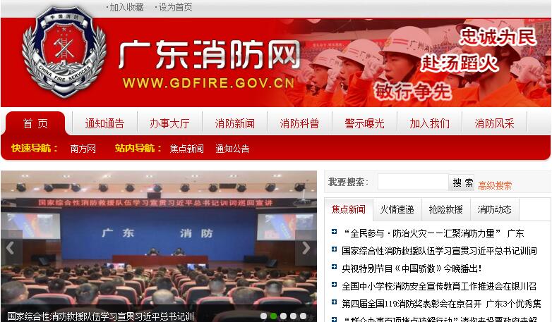 广东消防网由广东省公安消防总队主办。广东省公安消防总队是正师级公安现役部队,隶属于公安部消防局,执行解放军的条令条例,享受现役军人待遇机关设立司令部、政治部、后勤部、防火监督部四大部门。司令部下设警务处、战训处、信息通讯处、秘书处、管理处;政治部下设干部处、组教处、纪检保卫处;后勤部下设财务处、营房装备处、供给处、审计处、生产管理处;防火监督部下设指导处、建审处、法规处、技术处、宣传处。总队机关共计18个处。广东省公安消防总队下设21个消防支队(其中1个一类支队、11个五类支队、9个类支队);153个消防大队、消防科(其中7个特勤大队、142个常规大队、4个消防科);170个消防中队(其中19个特勤中队、151个常规中队)。目前,全省21个地级市全部设立了消防支队(深圳市为公安编制的支队);全省除广州、深圳下设的市、区外(广州市区设立了一至四大队,但未落实一区一大队,深圳市区是公安编制的消防大队),其余109个县、市、区全部设立了消防大队(消防科);全省还有1个县未建立消防中队(河源市和平县)。全省消防部队编制总数为5900名(其中干部编制数2026名、士官编制数2181名、士兵编制数1693名)。按部门分为:总队机关及直属单位137名,总队直属特勤大队90名,总队教导大队50名,各市消防支队机关编制数637名,各县、市、区消防大队(消防科)编制数775名,各县、市、区消防中队编制数4211名。现实力总人数为6113(老兵退役前)。
