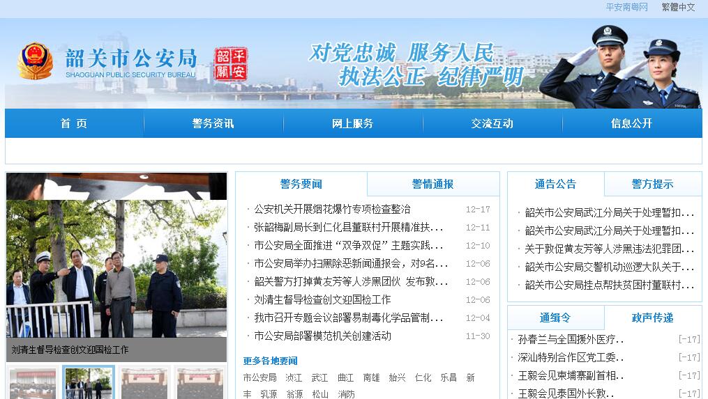 | 网站简介: 韶关市公安局是市政府主管全市公安工作的工作部门。主要承担着以下职责:(一)贯彻执行公安工作的方针、政策和法律、法规,起草地方性公安法规、规章。组织开展全市公安工作,并指导、检查落实。(二)预防、打击和侦查各类违法犯罪活动。(三)维护社会治安秩序。(四)维护交通安全和交通秩序,处理交通事故。(五)管理全市出入境、治安、户政工作。(六)依法管理、指导全市监所工作。(七)指导、管理并监督机关、团体、企事业单位的安全保卫工作和企事业单位公安保卫组织的建设。(八)警卫国家规定的特定人员,守卫重要的场所和设施。(九)监督管理全市计算机信息系统的安全保护工作。(十)组织、实施消防工作,实行消防监督。(十一)指导全市公安机关组织建设和队伍建设。(十二)指导、检查、监督全市公安机关的执法活动。(十三)承办市委、市政府和上级公安机关交办的其它事项。 |