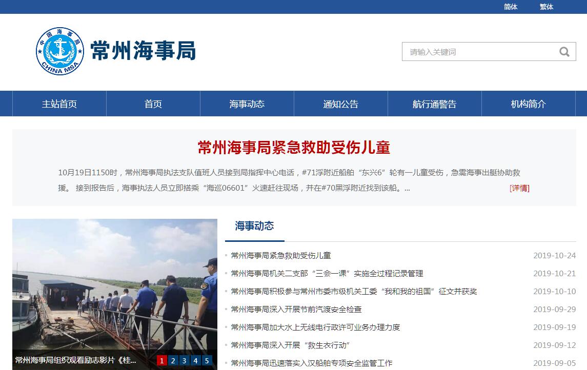 | 网站简介: 常州海事局(全称为“中华人民共和国常州海事局”),实行垂直管理体制,根据法律法规的授权,对内依法履行保障水上交通安全、保护水上环境清洁、保护船员整体权益、维护国家海上主权等职责,对外代表政府履行相关国际公约、行使口岸开放监管职能,为常州港四家口岸查验机构的牵头单位。常州海事处成立于2001年1月18日,2008年1月28日,中华人民共和国交通部交人劳发[2008]36号文批复:将中华人民共和国江苏常州海事处的机构级别由副处级调整为正处级。2012年2月,在交通运输部、中国海事局以及江苏省人民政府、常州市人民政府的大力关心和支持下,中央机构编制委员会办公室正式批复设立中华人民共和国常州海事局。 |