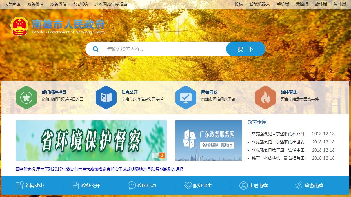 南雄市地处广东省东北部,大庾岭南麓,毗邻江西,全市总面积2326.18平方公里,辖18个镇(街道),232个村(居)委会,户籍人口48万。南雄是“中央苏区县”“国家可持续发展实验区”,中国“黄烟之乡”“银杏之乡”“恐龙之乡”“特色竹乡”“姓氏文化名都”,全国绿化模范单位,还是广东省“文明城市”“卫生城市”“双拥模范县(市)”“历史文化名城”“林业生态县”。近年来,南雄市经济社会步入快速发展阶段,先后竞得国家电子商务进农村综合示范县、全国建制镇示范试点、全国休闲农业与生态旅游示范县、省原中央苏区县域经济创新发展示范县、省扶持村级集体经济发展试点县、省级新农村示范片项目、省新型城镇化“2511”综合示范县等十多个国家级、省级竞争性项目,经济社会发展后劲充足。2017年,完成地区生产总值143.6亿元,地方公共财政预算收入6.1亿元,完成固定资产投资81.9亿元,三次产业比重调整优化为20.5:35.8:43.7。南雄历史源远流长。春秋时为百越地,战国属楚,秦属南海郡,两汉为南野县,三国时属吴国南野县卢陵郡。唐光宗元年(公元684年)置浈昌县,南汉乾亨四年在浈昌县置雄州,宋开宝四年置南雄州,明洪武元年置府,清嘉庆十二年改为直隶南雄州,民国时改为南雄县,隶属广东省。中华人民共和国成立后,沿袭不变,1996年撤县设市。南雄革命历程辉煌,1930年划归中央苏区管辖;《毛泽东选集》中提及的“水口战役”在此打响;红军长征后,项英、陈毅、陈丕显在南雄开展了三年游击战争,陈毅元帅在此写下著名的《梅岭三章》;1939年冬,中共广东省委迁驻南雄瑶坑,领导了全省的抗日救亡运动。2010年,南雄市被确认为“中央苏区县”。南雄交通区位优越。南雄历来有“居五岭之首,为江广之冲”和“枕楚跨粤,为南北咽喉”之称,自唐代名相张九龄奉旨开凿驿道后,就是岭南通往中原之要道。现在,广东的主要出省通道——韶赣铁路、韶赣高速公路、G323线、S342线贯穿全境,雄信高速公路进入专项评估报告编制阶段,四通八达的地方公路构成了南雄快捷便利的交通网络。从南雄到广州只需要3小时,到江西赣州只要2个小时。南雄已成为粤北和华南地区进入华中、华东地区的“桥头堡”,起到了承接珠三角、对接长三角的重要枢纽作用。交通环境的日趋成熟,进一步密切了南雄与外界特别是与珠三角等地区的联系。可以说,南雄已基本融入珠三角3小时经济圈。南雄物产资源丰富。主要资源有地热、矿产、森林、水力、药材等。全市现有耕地总面积4.34万公倾,有林地面积15.9万公顷,活立木蓄积量947.4万立方米,森林覆盖率达66.9%;毛竹总面积达2.6万公顷,是广东省毛竹的主要产区之一;主要农作物有水稻、花生、大豆,是国家和省双料“产粮大县”“全国粮食流通监督检查示范县”,“金友有机米”“金友有机米露”“金友贡米”“金友美香粘”“金友油粘米”荣获省高新技术产品称号;主要经济作物有黄烟、银杏、田七、罗汉果等;南雄板鸭是国家地理标志保护产品。黄烟作为南雄市支柱产业,已有300余年种植历史,烟叶品质上乘,在国内外具有极高知名度,被国家烟草专卖局列入全国现代烟草农业整县推进单位,烟农已发展至近万户。2017年,完成黄烟种植7.8万亩,烟叶收购量21.5万担。南雄旅游资源丰富。南雄旅名胜古迹众多,是一个集古色、红色、绿色、金色于一体的好地方。“古色”指珠玑古巷、梅关古道、千年古塔、千年古村、恐龙古迹等景点;“红色”指瑶坑广东省委机关旧址、水口战役纪念公园等景点;“绿色”指帽子峰森林公园、孔江国家湿地公园、小流坑-青嶂山省级自然保护区等景点;“金色”指千年银杏树王、坪田古银杏群等景点。南雄获批省旅游创新发展十强县(市),其中珠玑古巷·梅关古道荣获“国家4A级旅游景区”“首批省文化旅游融合发展示范区”等殊荣,梅关古道景区入选全国红色旅游经典景区名录,梅关古驿道保护利用项目荣获中国人居环境范例奖,帽子峰镇被认定为省森林小镇,帽子峰省级森林公园被评为“国家3A级旅游景区”、被誉为“小九寨沟”,主田镇评为广东省休闲农业与乡村旅游示范镇。此外,南雄市还成功举办了四届姓氏文化旅游节,被授予“中国姓氏文化名都”称号,被推介为“全国9个最美银杏观赏地”之一。2017年,全市接待旅游人数458.7万人次,同比增长15.1%;旅游总收入32.2亿元,同比增长18.1%。南雄发展态势向好。近年来,南雄市抢抓原中央苏区和粤东西北地区振兴发展等重大政策机遇,突出“产业攻坚、城镇提升、基础设施完善、农村发展”四个重点和“党的建设、信访维稳、务实改革”三个突破,推动全市经济社会持续平稳健康发展。一是工业转型稳步推进。坚持高质量发展主线,逐步形成以精细化工、竹纤维、新能源、新材料、建材为特色产业的工业体系。南雄产业转移工业园总规划面积约11000多亩,一期入园企业达到103家,试投产企业85家,高新技术企业18家,上市企业3家。2017年,园区一期实现工业总产值100.2亿元,占全市工业比重为82%。此外,广东绿洲生态科技发展有限公司、广东美瑞克微金属磁电科技有限公司签约落户园区二期。彤置富水泥项目已经试产,华电南雄热电冷联供、康绿宝增资扩产、云峰山生态旅游区等一大批重点企业(项目)加快建设。二是现代农业加快发展。积极创建南雄天润现