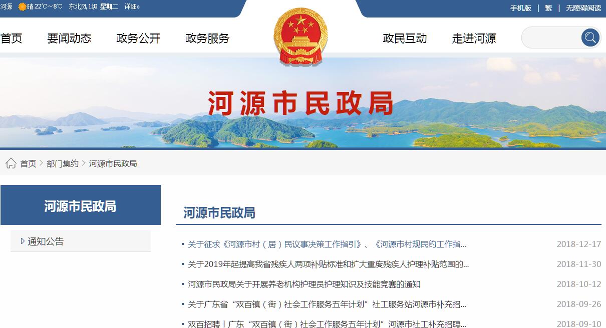 河源市民政局要职责:(一)贯彻执行国家、省有关民政工作的方针政策和法律法规,起草有关文件草案,并组织实施和监督检查。拟订民政事业和民政系统的社会工作发展规划,推进民政事业发展和民政系统社会工作人才队伍建设和相关志愿者队伍建设。(二)负责退役士兵、复员干部的接收安置工作和军队移交地方管理的离退休干部、退休士官和军队无军籍退休退职职工的接收安置、服务管理工作;负责抚恤优待、评残评烈、残疾军人安置、烈士褒扬和牺牲病故部队干部的家属安置工作;组织和协调拥军优属工作。(三)负责组织、协调城乡救灾工作,组织自然灾害救助应急体系建设,负责组织核查并统一发布灾情,管理、分配和监督市级救灾款物。(四)负责城乡居民最低生活保障、医疗救助、临时救助、流浪乞讨及生活无着人员救助工作,健全城乡社会救助体系;指导农村五保户供养、敬老院建设工作。(五)负责全市镇(乡)以上行政区域的设立、撤销、调整、更名、界线变更以及政府驻地迁移的审核报批工作,负责市际行政区域界线的勘定和管理,负责边界争议的调处事务,组织编制地名规划,负责地名命名、更名、销名审核工作,规范地名标志设置和管理工作。(六)提出加强和改进城乡基层政权建设的建议,推动基层民主政治建设,指导城乡基层群众自治组织建设、城乡社区建设和城乡社区服务体系建设。(七)负责社会福利机构的监督管理,促进慈善事业发展,指导社会捐助工作,指导老年人、孤儿和残疾人等特殊群体权益保障工作。(八)负责推进婚俗和殡葬改革,负责收养登记管理工作,指导婚姻、殡葬、收养、救助服务机构管理工作。(九)负责依法对社会团体、基金会、民办非企业单位进行登记管理和监察的责任,查处非法社会组织和社会组织的非法活动。(十)负责市老龄委员会日常工作。(十一)负责管理福利彩票销售工作,负责管理、使用、发放福利资金和民政事业费。(十二)承办市人民政府和上级民政部门交办的其他事项。