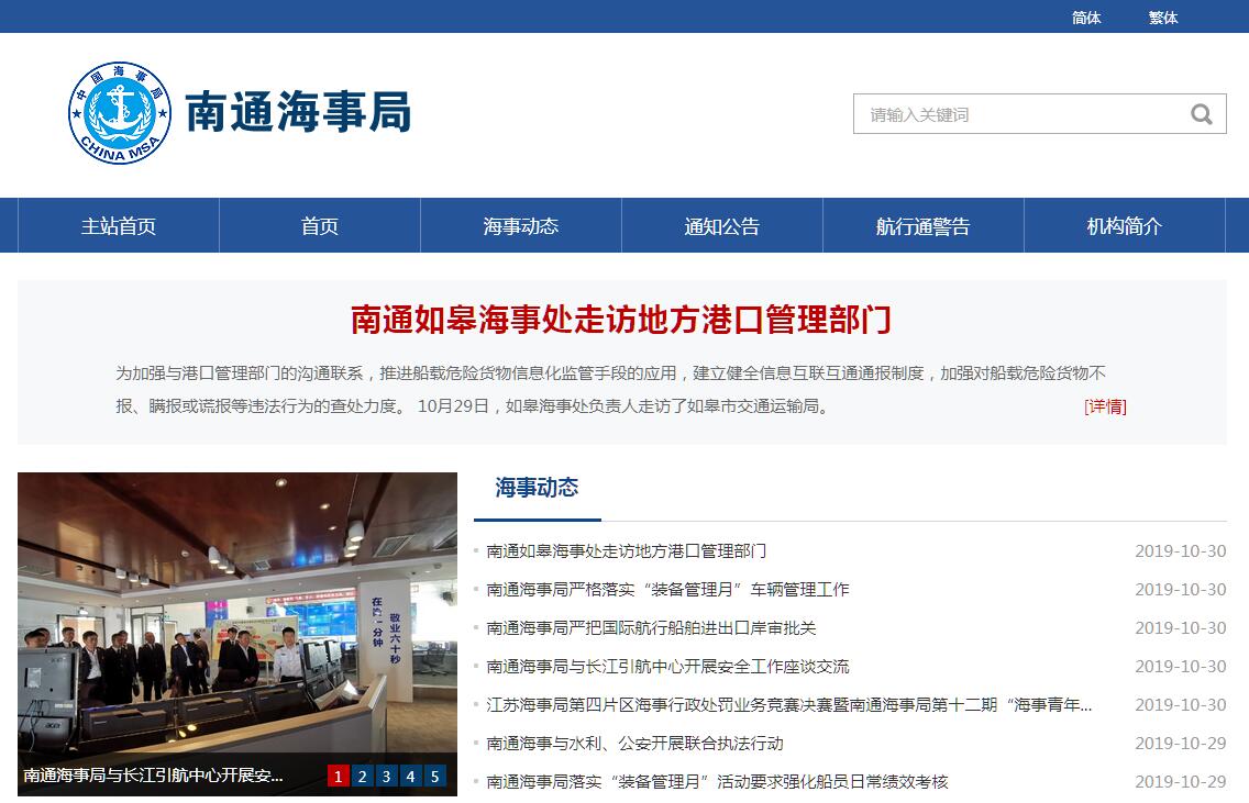 | 网站简介: 中华人民共和国南通海事局的主要职责为:贯彻执行国家海洋管理、环境保护、水上交通安全、通航保障、船舶和设施等方面的法律、法规和规范;中华人民共和国南通海事局是经中央编制委员会中编办[2000]第48号文批准成立,负责水上交通安全监督管理工作的行政管理机关。水上水下施工安全技术状况审核,码头、锚地和重要水域划定,港区岸线安全使用审核,航行警(通)告发布;通航环境管理与通航秩序的维护。 |