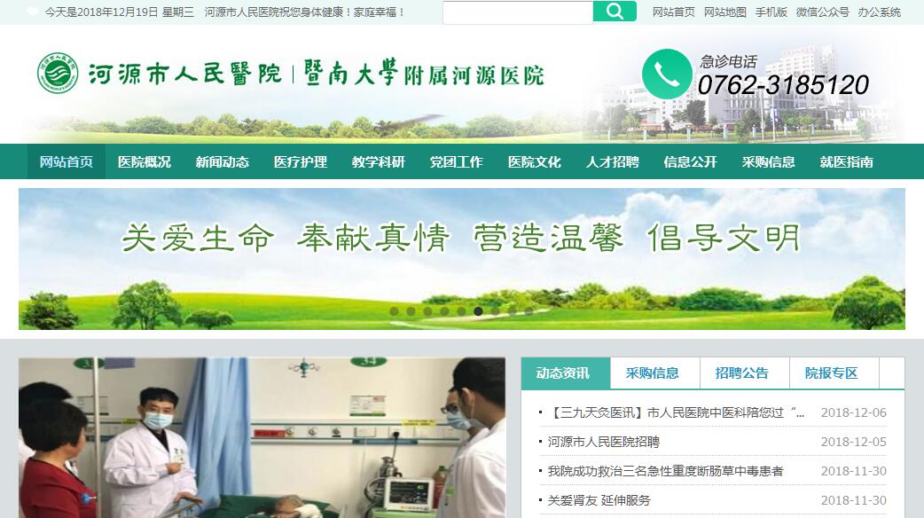 河源市人民医院创建于1906年,前身是瑞士巴差色教会创办的仁济医院,是三级甲等综合性医院,暨南大学附属医院,广东省高等医学院校教学医院,国家标准爱婴医院,全国卒中联盟协作医院,暨南大学第一临床医学院共建的医学研究生联合培养基地,全国第一批住院医师规范化培训基地。医院占地总面积13万平方米,编制床位1486张。全院总开放床位1150张。2017年,门诊量70.6万人次;出院人数3.78万人;手术14782人次。医院在职职工1520人,其中卫生技术人员1343人,高级职称249人(其中正高职称55人),博士学历4人,硕士学历89人。医院拥有肿瘤放疗直线加速器、核磁共振(2台)、螺旋CT (2台)、大孔径多层螺旋定位CT 、放射治疗模拟机,数字减影血管造影系统(DSA)、DR(2台)、彩色B超(8台)、数字化乳腺钼靶机、数字化胃肠机、腹腔镜、关节镜、泌尿外科混合动力碎石清石系统、电子胃肠镜及临床检验等医疗设备。目前设临床专科33个,医技科室8个。临床专科:心血管内科、神经内科、肾内科、内分泌科、风湿免疫科、血液净化室、感染科、呼吸内科、消化内科、血液内科、老年病科、肿瘤科、儿科、普通外科、泌尿外科、烧伤整形科、肛肠科、骨科、神经外科、胸外科、心脏外科和介入血管科、乳腺外科、妇产科、耳鼻喉科、眼科、口腔科、麻醉科、重症医学科、急诊科、皮肤科、康复医学科、中医科、高压氧科、体检科。医技科室:检验科、放射科、病理科、超声医学科、心功能科、输血科、营养科、消毒供应室。广东省重点临床专科:骨科、神经内科;省重点扶持建设临床专科:眼科。开展了心脏介入治疗、心脏起搏器植入术、射频消融技术,脑血管介入治疗,综合血管介入治疗,多部位多类型脑肿瘤切除术,肿瘤放射治疗,人工瓣膜置换及整形术、冠状动脉搭桥术,胸腔镜下心脏微创手术,腹腔镜下普外、泌尿外科、妇科微创手术,肾癌根治术,上胸椎椎管椎体内肿瘤及纵膈内巨大肿瘤切除术、高位颈椎复杂骨折固定术、寰枢椎不稳颈2椎板螺钉内固定术、高位颈椎肿瘤切除术、脊柱侧弯矫正术、全髋、全膝关节置换术、关节镜手术、喉癌根治术,缺血性脑卒中超早溶栓治疗。暨南大学附属第一医院全面合作单位,中山大学附属口腔医院、附属肿瘤医院、北京大学深圳医院对口帮扶单位,中山大学孙逸仙纪念医院医疗技术协作单位;省人民医院心血管研究所“复杂性先心病防治网络建设和优化治疗策略研究”科研合作单位。广东医科大学、广东药科大学、赣南医学院等医学院校的教学医院。17个住院医师规范培训专业基地,2012年以来,承担省级科研项目7项,SCI收录论文2篇;2017-2018年国家级继续医学教育项目2项,2015-2018年省级继续医学教育项目30项,省卫计适应技术项目入库9项。获省适宜卫生技术推广项目7项;2012年以来,获市级科技进步奖15项(其中二等奖1项)。学校先后与江西吉安职业技术学院、揭阳职业技术学院、和平县技工学校、河源市现代职业技术学校等7所院校建立了对口帮扶关系,与深圳职业技术学院等国家示范性高职院校的友好合作关系。与台湾14所高校签订了合作协议,开展短期交流生项目;与美国的康涅狄格大学、美国马里兰大学、加拿大温莎大学、澳大利亚中央昆士兰大学、澳大利亚卧龙岗大学等国外知名大学建立合作关系,探索开展“3+1”、“2+2”模式的联合人才培养,学校的国际化水平逐步提升。