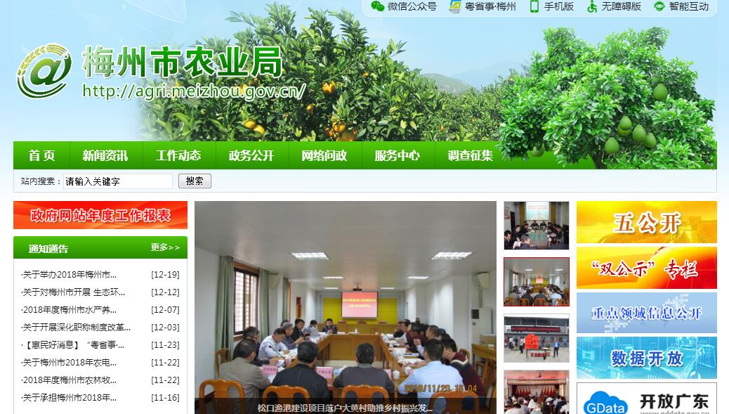 梅州市农业局主要职责:(一)贯彻执行国家有关农业农村工作的方针、政策和法律、法规;拟订有关农业地方性管理规定;组织开展农业和农村经济社会改革与发展重大问题的调查研究,并提出建议,指导社会主义新农村建设和农村改革。(二)拟订种植业、水产养殖业、农业机械化等农业有关产业(以下简称农业)和农村经济发展战略、中长期规划并指导实施,参与制定相关涉农管理规定。(三)承担完善农村经营管理体制的工作,研究提出深化农村经济体制改革和稳定完善农村基本经营制度的建议,指导农村土地承包经营权流转,承包纠纷仲裁和农村集体资产管理,指导、监督减轻农民负担和村民筹资筹劳管理工作,拟订农业产业化经营发展规划并组织实施,指导农业社会化服务体系、农村合作经济组织、农民专业合作社的建设和发展。(四)组织落实促进粮食、水果、水产品等主要农产品生产发展的相关政策措施,引导农业产业结构调整和产品品质的改善,指导实施农业标准化、规模化生产,会同有关部门提出农业固定资产投资的规模、方向和有关财政性资金安排的意见,提出扶持农业农村发展的财政、项目的建议,拟订农业开发规划并监督实施,组织实施农业综合开发项目。(五)拟订农产品加工工业发展规划并组织实施,促进农业产前、产中、产后一体化发展,提出农业产业保护、促进大宗农产品流通和农产品进出口的建议,参与拟订农产品专业批发市场体系建设与发展规划,培育、保护和发展农产品品牌。(六)承担提升农产品质量安全水平责任,依法开展农产品质量安全风险评估,及时向上级部门提供农产品质量安全状况,负责农产品质量安全监测,依法组织实施符合安全标准的农产品认证和农产品质量的监督管理。(七)依法开展农作物种子(种苗)、肥料、农药等行政执法检查;负责农业机械生产安全、渔业生产安全和农产品质量安全的监督管理。(八)负责农作物种植业和渔业重大病虫监测预警和防控,会同有关部门制定农作物和水生动物防疫检疫规定,组织监督农作物和水生动物防疫检疫工作;组织重大农作物和水生动物检疫性有害生物监测、普查,负责境外引进农作物种子(种苗)和水生动物检疫有关工作。(九)指导农业救灾复产工作,收集和统计农业灾情,组织种子等救灾物资的调备和下拨,提出生产救灾安全建议,指导农业灾后恢复生产,组织农业重大突发事件应急管理。(十)制定农业科技、农技推广的规划,拟订有关规定,指导现代农业产业化体系和技术推广体系建设,组织实施农业科研、成果转化、科技示范和技术下乡,组织协调引进农业优良品种与先进技术,负责农业科技成果管理、农业新品种保护和农业转基因生物安全监督管理。(十一)会同有关部门拟订农业农村人才队伍建设规划并组织实施,指导农业教育和农业职业技能开发工作,参与组织实施农村实用人才培训和农村劳动力转移就业培训工作,会同有关部门依法实施农业农村人才专业技术资格管理。(十二)组织农业资源区划工作,指导农业生物物种资源的保护和管理,负责主管的野生植物和水生动物保护工作;拟订耕地及基本农田质量保护与改良政策并指导实施;依法管理耕地质量,会同有关部门拟订农田基本建设规划,指导发展节水农业。(十三)制定并实施农业生态建设规划,指导农村可再生能源综合开发与利用;农业生物质产业发展和农村节能减排,指导农业面源污染治理的有关工作,指导、协调划定农产品禁止生产区域工作。(十四)管理农业和农村经济信息,会同有关部门监测分析农业和农村经济运行情况,开展相关农业统计工作,综合分析和反映“三农”工作动态,收集农业和农村经济信息,负责农业信息体系建设,指导农业信息服务。(十五)承办市委、市政府和上级业务主管部门交办的其他事项。