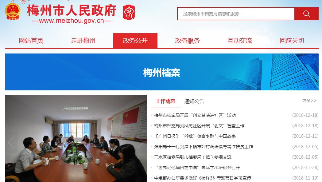 梅州市档案局(馆)履行档案行政管理和档案保管利用两种职能。其主要职责:一、贯彻执行党和国家关于档案工作的方针政策、法律法规,制订档案工作的规划、计划和管理制度,并组织实施,对全市档案工作实行统筹规划,宏观管理。二、对全市国家综合档案馆和专业档案馆及市直各机关、团体、企事业单位、重点工程建设、开发区的档案工作进行监督指导和检查,开展档案业务咨询服务。三、组织指导开展档案宣传、档案科学技术研究和科研成果推广应用及档案的学术交流活动。四、开展《档案法》的贯彻、落实和执行监督工作,对违反《档案法》的案件进行依法查处。五、组织指导全市档案业务培训工作。会同有关部门做好档案专业技术职务评聘有关工作。六、集中统一管理各类历史档案资料和建国后市直各机关、团体、企事业单位具有长久保存价值的各载体、各门类的档案资料,保守党和国家机密,维护档案的完整与安全。七、负责市直各有关单位各载体、各门类档案资料的接收、征集、整理、保管、鉴定和抢救工作以及档案管理现代化的科研工作。八、负责档案的展览、陈列、编纂出版,做好档案的利用工作,开放到期档案,为社会各方面提供服务。九、承办市委、市政府及上级档案部门交办的其它事项。