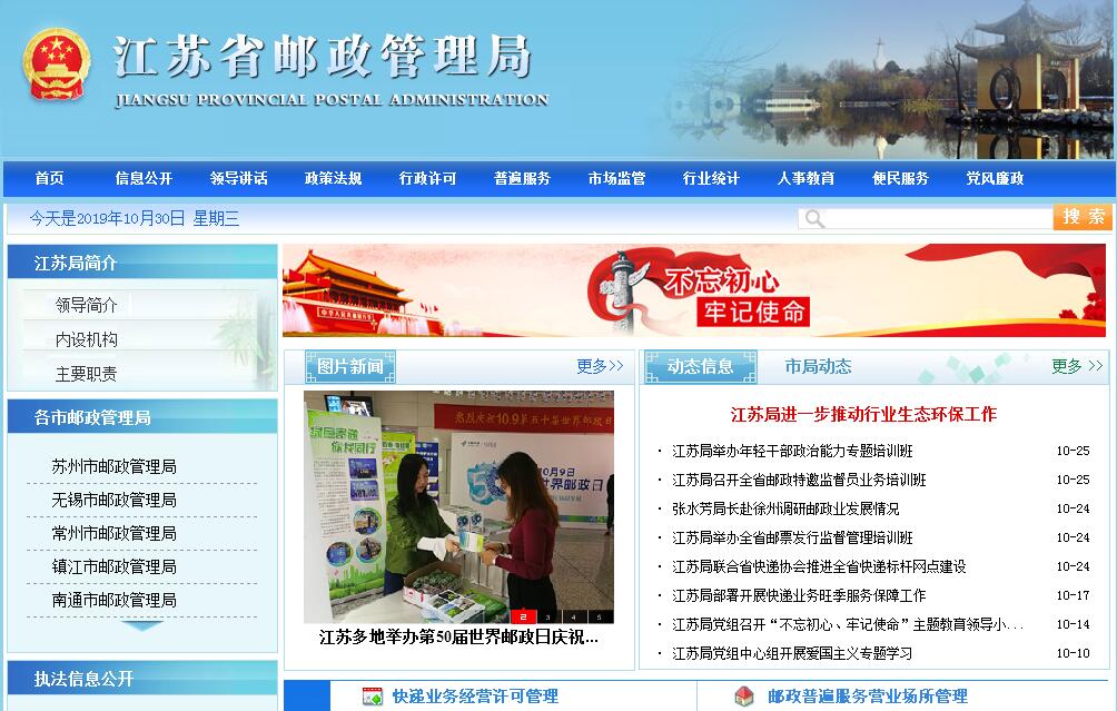 | 网站简介: 江苏省邮政管理局于2006年9月8日正式成立,是经国务院批准设立的副厅级邮政监管机构,负责全省邮政行业管理工作,履行政府监管职能,受国家邮政局垂直领导,且实行党组制,党的关系在地方。根据国务院邮政体制改革方案,江苏省邮政公司也于2007年3月22日成立,并与江苏省邮政管理局同时对外揭牌,原江苏省邮政局被撤销,标志着江苏邮政政企分开工作基本完成。 |