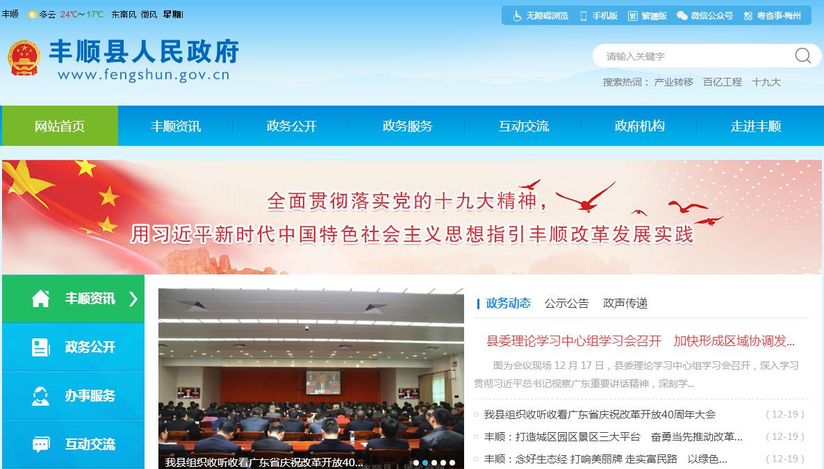 丰顺县位于广东省东部、梅州市南端,毗邻潮汕地区。清乾隆三年(1738年)建置。2015年辖16个镇、1个国有农场,行政区域面积2710.22平方千米。总人口70万人。是泰国前总理他信和英拉兄妹的祖居地,是洋务运动领袖丁日昌、华夏女杰李坚真的故乡,同时也是中国温泉之城、中国长寿之乡、中国金融生态县、中央苏区县、国家可持续发展实验区、广东电声之都。区位优越,交通便捷。汕梅高速公路、广梅汕铁路纵贯南北,直达揭阳潮汕机场、厦深高铁潮汕站和揭阳、潮州、汕头港口分别仅需半小时、1小时的车程。随着梅汕高铁、大丰华高速公路动工建设,丰顺成为对接珠三角、融入汕潮揭、借力海西区的重要节点。生态秀美,资源丰富。森林覆盖率76.84%,海拔千米以上高峰57座,铜鼓峰海拔1559.5米,居粤东之首。温泉资源遍布全县8个镇,主要地热田9处,日可采地热资源总量3.09万吨,最高水温92℃,富含偏硅酸、氟、氡和硫黄等多种元素,县城汤坑建有新中国第一座地热发电站。铁矿、铅锌矿、稀土等矿产资源和水能资源丰富。人文厚重,客潮相融。客家与潮汕两大民系和谐共处,孕育出典型的“半山客”文化。有省内独特的畲族风情及埔寨“烧火龙”。有50万华侨遍布30多个国家和地区。朱德、陈毅、林彪、罗荣桓、聂荣臻、粟裕等著名将领曾在此留下战斗足迹,八乡山是东江苏维埃政府和红十一军诞生地。产业升级,经济崛起。丰顺是全国三大电声产业基地之一,是广东省电声产业集群升级示范区。茶叶、红薯、橄榄是“丰顺三宝”。有八乡山生态旅游区、韩山森林公园、千江温泉度假村、韩江鹿湖温泉度假村、龙鲸河漂流、龙归飞瀑、揭岭飞泉、铜鼓峰等景区景点。