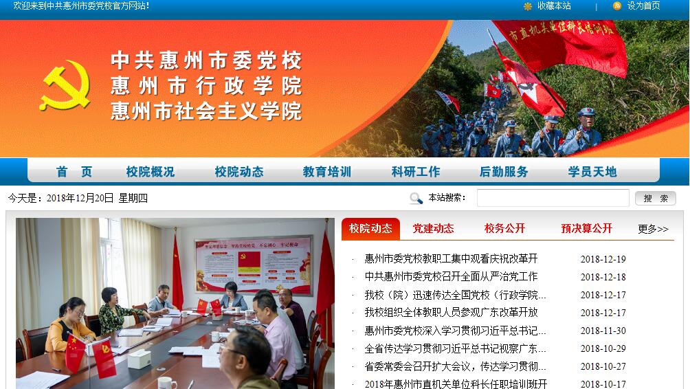 中共惠州市委党校前身为中共惠阳地委党校,建校于一九五六年二月,一九八八年三月撤地设市改称现名。一九九三年十一月兼办惠州市行政学院,二OO三年三月兼办惠州市社会主义学院,实行"三块牌子,一套班子"。校园座落在惠州市区鹅岭南路60号,紧靠惠深公路,交通便利,环境优美,校园多年被市评为"花园式先进单位"。校园占地面积67184平方米,建筑面积21493平方米,现有教学楼二幢、办公楼一幢,学员宿舍楼三幢。拥有60人左右的多媒体课室8间、1个50台电脑培训室、10间学员讨论室,含200人以上的多功能厅2个,学员楼宿舍141间,可同时容纳250人住宿。该校自一九九六年八月起实行校委领导体制,市委领导兼任校长,设校委7人,其中常务副校长1人,副校长3人,校委3人。下设十四个科室(校委办公室、教务一科、教务二科、行政科、政治建设教研室、经济建设教研室、文化建设教研室、党的建设教研室、科研办公室、函授站、图书馆、离退休干部管理科、统一战线理论教研室、信息网络中心)。党的组织设机关党委,下设四个党支部,在职党员60名。该校现有在编人员中教授1人,博士3人,副高职称16人,讲师8人。建校以来,在市委的直接领导下,在中央党校和省委党校的指导下,紧密配合党在各个历史时期的中心任务,结合本地实际,发挥自身优势,努力把党校办出特色:在办学的指导思想上坚持"党性铸校、质量兴校、科研兴校、人才强校、从严治校"。尤其是十二五以来,在市委的正确领导下,市委党校能坚持正确办学方向,深入学习贯彻习近平总书记系列重要讲话精神,贯彻落实中央、省委要求和市委部署,在干部培训、思想引领、理论建设、决策咨询等方面扎实工作,为加强党的思想理论建设、促进全市经济社会发展作出了积极贡献。五年来,共培训轮训干部年均超过1.3万人(次),位居全省市级党校前列。特别是,我们大胆创新党的理论和党性教育方式方法,精心打造了第一批12个现场教学基地,先后有6000多名学员参加了现场教学活动。