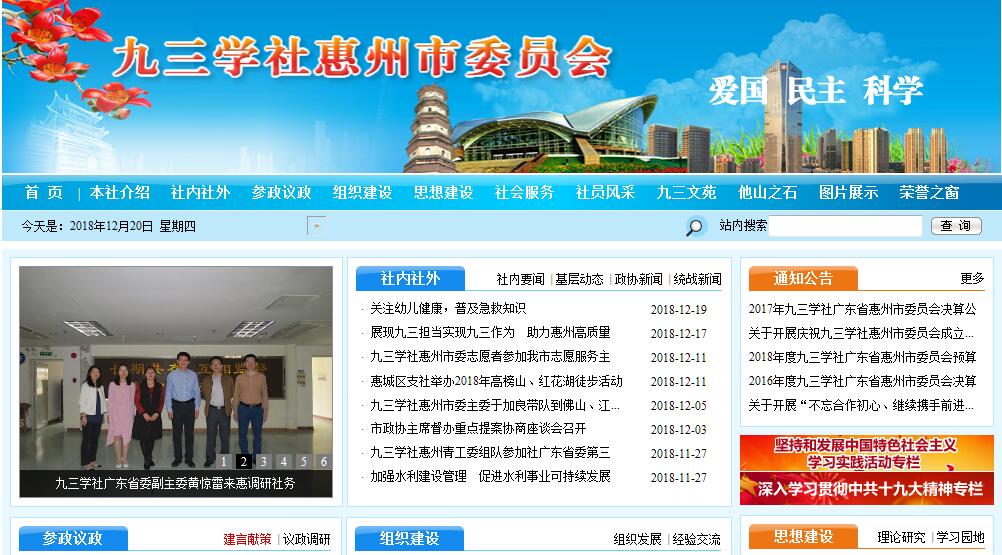 九三学社是以科学技术界高、中级知识分子为主的具有政治联盟特点的致力于社会主义事业的政党。九三学社惠州小组(市委会前身)于1987年8月成立,社员6人。1989年9月成立九三学社惠州市第一届支社委员会,社员13人。1996年11月成立九三学社惠州市筹委会,社员44人。1998年4月成立九三学社惠州市委员会,社员45人。2002年5月、2006年12月分别召开代表大会选举产生九三学社惠州市第二届、第三届委员会,社员分别为61人、118人。2011年9月18日,九三学社惠州市第四次代表大会选举产生九三学社惠州市第四届委员会,社员175人。许玩宏当选为主任委员,于加良、桂勤(女)、刘亚红(女)、许汉标当选为副主任委员,任命刘亚红为秘书长(兼)。截止2012年12月底,惠州市有九三学社社员194名,其中中级以上技术职称,占社员总数的94.8%,女社员占37.6%。社员主要集中在科学技术界、高等教育界和医药卫生界。社员中有各级人大代表5人、政协委员24人,特邀人员8人。多年来,九三学社惠州市委员会在九三学社广东省委员会和中共惠州市委的领导下,围绕惠州中心工作,发挥自身优势,认真履行参政议政、民主监督职能,全面推进自身建设,坚持突出特色,服务社会,为惠州经济社会各项事业又好又快发展做出了积极的贡献。今后,要以科学发展观为指导,弘扬爱国、民主、科学精神,建设适应新时期要求的高素质参政党,为中国多党合作事业的发展,为加快转型升级、建设科学发展的惠民之州贡献智慧和力量。