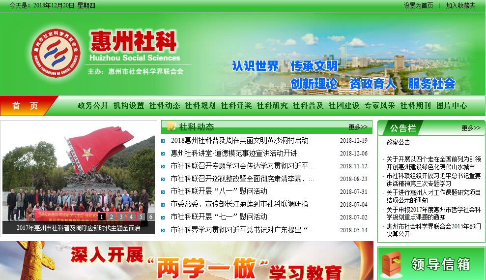 | 网站简介: 惠州市社会科学界联合会主要职责是:(一)指导、联络和协调社会科学类学会、研究会、协会的工作以及指导县(市、区)社科联的工作;(二)组织开展各学术理论研究活动,积极促进和开展国内外的学术交流;(三)组织开展社会科学的宣传普及和智力开发、咨询服务工作;(四)组织开展优秀社会科学成果的评奖活动,配合开展全市社会科学规划工作及其负责社会科学著作出版基金筹资、资助、管理等工作;(五)收集、整理社会科学研究信息,为市委、市政府提供社会科学研究信息服务;(六)组织社会科学界积极参与社会协商对话、民主监督和民主管理;(七)维护本会所代表的社会科学工作者及其团体的合法权益;(八)组织、推动全市社科界完成市委、市政府交给的各项任务,承办市委、市政府交办的其他事项。 |