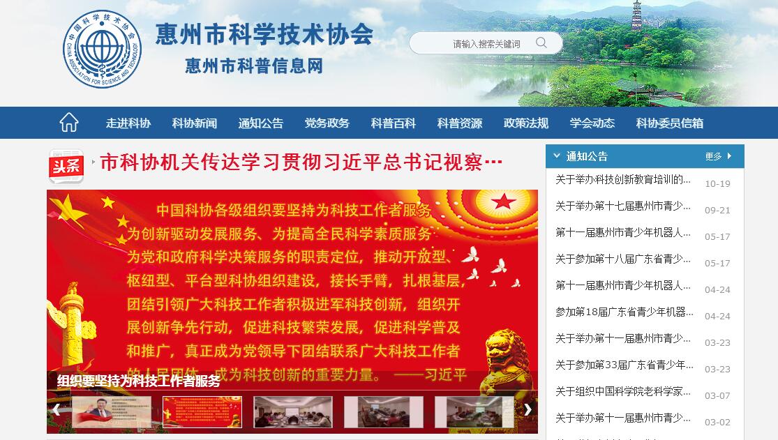 惠州市科学技术协会(简称惠州市科协)是惠州市科学技术工作者的群众组织,是中共惠州市委领导下的人民团体,是市委、市政府联系科学技术工作者的桥梁和纽带,是我市推动科学技术事业发展的重要力量。惠州市科协的前身是惠阳地区科学技术协会,成立于1979年10月29日,1988年3月,惠阳地区改为惠州市,地区科协改为市科协。历任主席为罗章、余继民、钟楚杰、朱碧岩、邹平生、黄细花,现任主席为罗金星。惠州市科协由市级学会、协会、研究会(简称市级学会)和县(区)科学技术协会、院校协会、企业科协及基层组织组成。现有直属单位2个(惠州科技馆、惠州科技咨询服务中心),市级学会28个,县(区)科协7个,高校和科研院所科协3所,企业科协8家。省级以上科普教育基地17家、市级38家。惠州市科协围绕市委、市政府的中心工作,以团结带领广大科技工作者为经济社会发展服务和推动科技创新、科学普及、科技社团建设为主要任务,全面履行“为科技工作者服务、为创新驱动发展服务、为提高全民科学素质服务、为党和政府科学决策服务”的职责,切实增强科协组织的“政治性、先进性、群众性”,积极推动“开放型、枢纽型、平台型”科协组织建设,按照“增强信心、实干求效、协同努力、创新发展”的科协工作理念,开拓进取,奋力作为,为广东实现“三个定位、两个率先”和“四个坚持、三个支撑、两个走在前列”的目标,为惠州奋力建设绿色化现代山水城市作出了积极贡献。