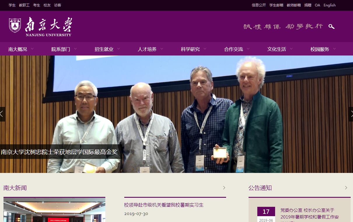 南京大学坐落于钟灵毓秀、虎踞龙蟠的金陵古都,是一所历史悠久、声誉卓著的百年名校。其前身是创建于1902年的三江师范学堂,此后历经两江师范学堂、南京高等师范学校、国立东南大学、第四中山大学、国立中央大学、国立南京大学等历史时期,于1950年更名为南京大学。1952年,在全国高校院系调整中,南京大学调整出工学、农学、师范等部分院系后与创办于1888年的金陵大学文、理学院等合并,仍名南京大学。校址从四牌楼迁至鼓楼金大原址。在一个多世纪的办学历程中,南京大学及其前身与时代同呼吸、与民族共命运,谋国家之强盛、求科学之进步,为国家的富强和民族的振兴做出了重要的贡献。尤其是改革开放以来,作为教育部直属的重点综合性大学,南京大学又在崭新的历史机遇中焕发出新的生机,在教学、科研和社会服务等各个领域保持良好的发展态势,各项办学指标和综合实力均位居全国高校前列。1994年,南京大学被确定为国家“211工程”重点支持的大学;1999年,南京大学进入国家“985工程”首批重点建设的高水平大学行列;2006年,教育部和江苏省再次签订重点共建南京大学的协议;2011年,教育部和江苏省签署协议继续重点共建南京大学;2016年,南京大学入选首批国家级双创示范基地;2017年,南京大学入选A类世界一流大学建设高校名单,15个学科入选世界一流学科建设名单。南京大学目前拥有仙林、鼓楼、浦口三个校区,有29个直属院系,各类学生总计34580人,其中本科生13196人、硕士研究生12195人、博士研究生6036人、外国留学生3153人。全校设本科专业86个,专业硕士学位授权点24个,专业博士学位授权点1个,硕士学位授权一级学科10个,硕士学位授权二级学科点(不含一级学科覆盖点)6个,博士学位授权一级学科41个,博士学位授权二级学科点(不含一级学科覆盖点)2个,博士后流动站38个,国家级人才培养基地12个;有一级学科国家重点学科8个,二级学科国家重点学科13个,江苏高校优势学科建设工程二期项目立项学科与重点序列学科20个;有国家实验室(筹)1个,国家级2011协同创新中心2个,国家重点实验室7个,教育部重点实验室8个,江苏高校协同创新中心5个,江苏省重点(工程)实验室10个,国家工程技术研究中心1个,国家地方联合工程研究中心1个,教育部工程中心2个,环境保护部工程技术研究中心1个,国防科工局国防重点学科实验室1个,国家测绘地理信息局重点实验室1个,江苏省工程中心10个,教育部人文社会科学重点研究基地4个,国家高端智库建设培育单位1个。学校拥有一支高素质的师资队伍,其中包括中国科学院院士29人,中国工程院院士3人,中国科学院外籍院士1人,第三世界科学院院士4人,俄罗斯科学院院士1人,加拿大皇家科学院院士1人,“千人计划”创新人才31人、创业人才14人、“外专千人计划”入选者4人,“万人计划”科技创新领军人才10人、哲学社会科学领军人才3人、百千万工程领军人才2人、教学名师2人,教育部“长江学者奖励计划”特聘教授97人、讲座教授25人,国家杰出青年基金获得者117人,国家级教学名师10人,国务院学位委员会学科评议组成员22人,国家级有突出贡献的中青年科学、技术、管理专家27人,国家重点研发计划、国家科技重大专项、重大科学研究计划、“973计划”、863计划等重大项目首席科学家76人次,“青年千人计划”入选者113人,“万人计划”青年拔尖人才8人,教育部“新世纪优秀人才支持计划”入选者238人,“百千万人才工程”国家级人选34人。春风化雨、桃李芬芳。在过去的一个多世纪中,南京大学始终坚持育人为本,在各个历史阶段培养和造就了众多中华英才,他们在各自的领域建功立业、成就卓著。改革开放以来,南京大学在教育教学改革中进行了多方面的探索,形成了许多重要的教育思想和教学理念,在国内外高等教育界产生了重要的影响。当前,南京大学提出了“办中国最好的本科教育”的奋斗目标,坚持“学科建设与本科教学融通,通识教育与个性化培养融通,拓宽基础与强化实践融通,学会学习与学会做人融通” 的人才培养理念,不断深化创新人才培养机制改革,积极为社会各行各业培养具有创新精神、实践能力和国际视野的未来领军人才和拔尖创新人才。南京大学的前身即“以科学名世”,格物致知、追求真理的科学精神和传统始终贯穿于南京大学的发展史中,成为南京大学办学最重要的特色。一代又一代的南大人孜孜求索、攀高攻坚、为国争光、为民造福,涌现出一大批优秀的科研成果,蜚声国内外学界。今日南京大学以“加强应用、注重基础、发展边缘、促进联合”为方针,以“基础研究面向国际学术前沿,应用研究面向国家战略需求和国民经济建设主战场、致力于解决关系国计民生的重大理论和现实问题”为指导思想,调整科研布局、加强科研组织,整体提高原创科研能力与水平,将南京大学建成我国重要的科学研究中心。自上个世纪初建校以来,南京大学就一直是开展国际交流与合作最活跃的中国大学之一,与世界上众多一流大学和高水平科研机构建立了紧密的协作关系。其中,始建于20世纪80年代的南京大学-霍普金斯大学中美文化研究中心迄今已成功举办三十年,它是中国改革开放以后最早实施的高等教育国际合作长期项目,为中美文化交流事业培养了众多骨干人才,在海内外产生了巨大的影响。目前,