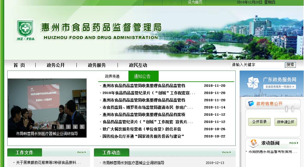 惠州市食品药品监督管理局主要职责是:(一)贯彻执行国家、省和市有关食品(含食品添加剂、保健食品、酒类食品,下同)安全、药品(含中药、民族药,下同)、医疗器械、化妆品监督管理的方针政策、法律法规和规章,研究制定相关的实施办法并监督实施,推动建立落实食品药品安全企业主体责任、地方政府负总责的机制,建立食品药品重大信息直报制度,并组织实施和监督检查,着力防范区域性、系统性食品药品安全风险。(二)负责食品的行政许可和监督管理,组织实施食品安全管理规范。建立食品安全隐患排查治理机制,贯彻落实省食品安全检查年度计划、重大整顿治理方案。指导并组织开展食品安全宣传和信息发布工作,统一发布重大食品安全信息;组织开展食品安全重大专项治理和综合检查。根据食品安全风险监测计划开展食品安全风险监测工作。(三)监督实施国家药典等药品和医疗器械标准、分类管理制度。监督实施药品和医疗器械研制、生产、经营、使用质量管理规范。负责第一类医疗器械注册并监督检查。建立药品不良反应、医疗器械不良事件监测体系,并开展监测和处置工作。配合有关部门实施国家基本药物制度。负责药品、医疗器械的行政许可和监督管理,负责化妆品的监督管理,组织实施相关质量管理规范。组织实施处方药与非处方药分类管理制度。组织实施中药品种保护制度。(四)负责制定全市食品、药品、医疗器械、化妆品监督管理的稽查制度并组织实施,组织查处跨区域或者重大违法行为。监督实施问题产品召回和处置制度。(五)负责食品药品安全事故应急体系建设,组织和指导食品药品安全事故应急处置和调查处理工作,监督事故查处落实情况。(六)负责制定全市食品药品安全科技发展规划并组织实施,推动食品药品检验检测体系、电子监管体系和信息化建设。(七)负责开展食品药品安全宣传、教育培训、对外交流与合作。负责惠城区、仲恺区、大亚湾区食品药品从业人员及相关岗位培训。推进诚信体系建设。(八)指导各县(区)食品药品监督管理工作,规范行政执法行为,完善行政执法与刑事司法衔接机制。(九)指导本地区食品药品检验机构的业务工作。(十)承担市食品安全委员会日常工作,负责食品安全监督管理综合协调,推动健全协调联动机制。督促检查市有关部门和县级人民政府履行食品药品安全监督管理职责并负责考核评价。(十一)承办市人民政府、省食品药品监督管理局以及市食品安全委员会交办的其他事项。