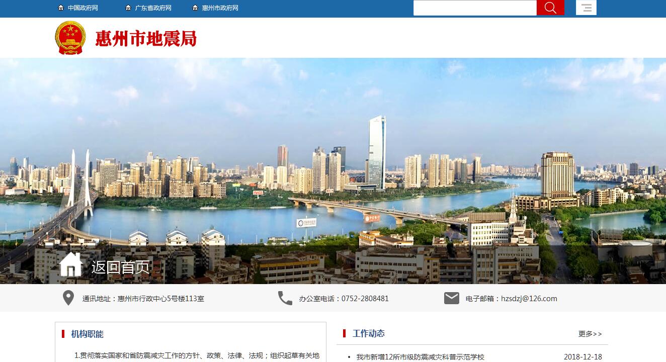 惠州市地震局主要职责:1.贯彻落实国家和省防震减灾工作的方针、政策、法律、法规;组织起草有关地方性管理法规规章;会同同级有关部门编制本行政区域的防震减灾规划,编制城乡总体规划和国土利用规划。2.承担本级政府防震减灾监督管理的责任,依法行使综合监督管理职权,指导协调、监督检查防震减灾工作,查处违法行为。3.管理地震监测预测和群测群防工作。制定本地区地震监测预测规划;会同同级有关部门,划定地震观测环境保护范围,对在保护范围内的建设工程进行审核;组织开展震情跟踪、异常核查及群测群防工作。4.管理本地区地震烈度区划和震害预测工作;负责监督管理本行政区域内建设工程抗震设防要求和地震安全性评价工作;审定地震灾区重建的抗震设防标准,参与灾区重建规划编制工作;保护典型地震遗址、遗迹。5.指导和监督地震应急工作。会同有关部门编制本行政区域地震应急预案;指导有关单位编制地震应急预案、负责对地震应急预案的编制与实施、避护场所的设置管理、应急救援队伍的建设等工作的监督检查;承担政府抗震救灾指挥机构的日常工作。6.负责震情速报和地震灾情速报工作;管理地震灾害损失评估;及时收集、保存有关地震的资料和信息,并建立完整的档案。7.会同有关部门开展防震减灾知识的宣传教育工作。指导、协助、督促有关单位做好防震减灾知识的宣传教育和地震应急救援演练。8.推进地震科技现代化;组织管理地震科学技术研究、科技成果的推广应用;组织开展地震科技工作与交流;指导防震减灾事业有关的学会、协会工作。9.管理所属事业单位及地方地震台站;指导下一级地震工作机构的工作;协助辖区内专业地震台站的工作。10.承办本级政府和上一级地震工作管理机构交办的有关事项。