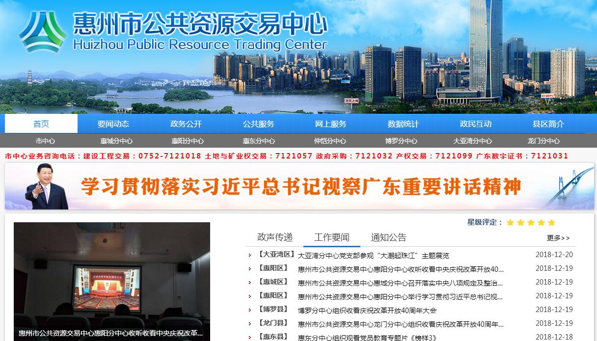 惠州市公共资源交易中心主要职责:(一)根据国家、省、市有关法律、法规和政策,制定公共资源进场交易和政府采购的服务、场内管理办法、各项业务操作规程,建立和完善内部管理制度。(二)为各项公共资源交易活动提供规范的场所、设施和服务,维护公共资源交易中心的交易秩序。依法开展政府采购、土地使用权与矿业权交易、建设工程招投标交易、产权交易等业务活动。(三)协助有关部门制定行业交易规范;负责核验交易项目相关手续及市场主体、中介机构资格,按有关规定抽取中介代理机构和评审专家。(四)发布各类公共资源交易信息,接受报名、安排交易时间和场地,依法组织交易活动,为公共资源各方主体提供法律手段和政策咨询与服务(五)为行业监督、行政监督及其他相关机构提供公共资源交易的监管平台,保存交易过程的相关资料备查,对场内交易活动的违法违纪行为,及时向行业监督、行政监督部门报告并协助调查。(六)依法成立项目评审委员会,并按照规程组织实施项目评审、公布评审结果。(七)负责公共资源交易资料信息分析、统计、储存,向有关部门报送统计报表及有关资料,接受行业主管部门、行政监管部门的业务指导、考核和监督。(八)承办上级部门交办的其它工作事项。