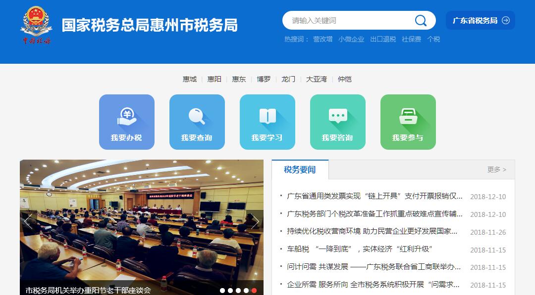 国家税务总局惠州市税务局的主要职责是:(一)负责贯彻执行党的路线、方针、政策,加强党的全面领导,履行全面从严治党责任,负责党的建设和思想政治建设工作。(二)负责贯彻执行税收、社会保险费和有关非税收入法律、法规、规章和规范性文件,研究制定具体实施办法。组织落实国家规定的税收优惠政策。(三)负责研究拟定本系统税收、社会保险费和有关非税收入中长期规划,参与拟定税收、社会保险费和有关非税收入预算目标并依法组织实施。负责本系统税收、社会保险费和有关非税收入的会统核算工作。组织开展收入分析预测。(四)负责开展税收经济分析和税收政策效应分析,为上级税务机关和惠州市委、市政府提供决策参考。(五)负责所辖区域内各项税收、社会保险费和有关非税收入征收管理。组织实施税(费)源监控和风险管理,加强大企业和自然人税收管理。(六)负责组织实施本系统税收、社会保险费和有关非税收入服务体系建设。组织开展纳税服务、税收宣传工作,保护纳税人、缴费人合法权益。承担涉及税收、社会保险费和有关非税收入的行政处罚听证、行政复议和行政诉讼事项。(七)负责所辖区域内国际税收和进出口税收管理工作,组织反避税调查和出口退税事项办理。(八)负责组织实施所辖区域内税务稽查和社会保险费、有关非税收入检查工作。(九)负责增值税专用发票、普通发票和其他各类发票管理。负责税收、社会保险费和有关非税收入票证管理。(十)负责组织实施本系统各项税收、社会保险费和有关非税收入征管信息化建设和数据治理工作。(十一)负责本系统内部控制机制建设工作,开展对本系统贯彻执行党中央、国务院重大决策及上级工作部署情况的督查督办,组织实施税收执法督察。(十二)负责本系统基层建设和干部队伍建设工作,加强领导班子和后备干部队伍建设,承担税务人才培养和干部教育培训工作。负责本系统绩效管理和干部考核工作。(十三)负责本系统机构、编制、经费和资产管理工作。(十四)完成国家税务总局广东省税务局和惠州市委、市政府交办的其他工作。