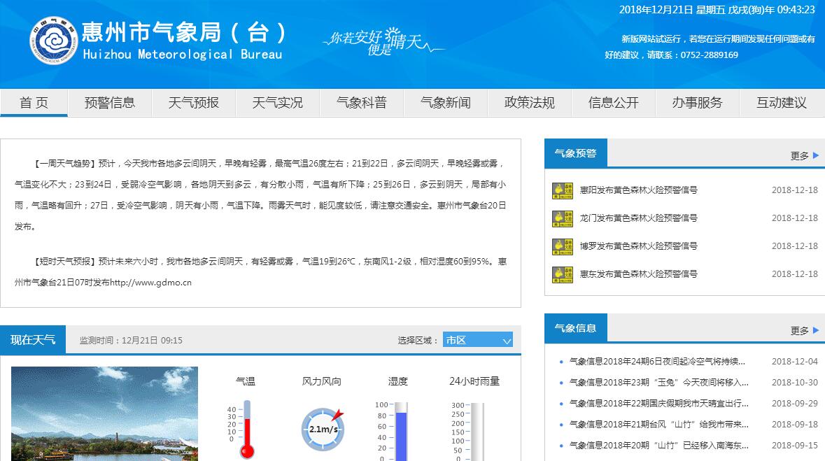 惠州市气象局主要职责:1.制定地方气象事业发展规划、计划,并负责本行政区域内气象事业发展规划、计划及气象业务建设的组织实施;负责本行政区域内重要气象设施建设项目的审查;对本行政区域内的气象活动进行指导、监督和行业管理。2.按照职责权限审批气象台站调整计划;组织管理本行政区域内气象探测资料的收集、处理;依法保护气象探测环境;管理本行政区域内气象标准化工作和涉外气象活动。3.负责市重大气象灾害应急指挥部日常工作;负责气象社会管理,承担防总、减灾委、应急委、安委会、规委会等部门赋予气象部门的工作任务。4.在本行政区域内组织对重大灾害性天气跨地区、跨部门的联合监测、预报工作,及时提出气象灾害防御措施,并对重大气象灾害做出评估,为本级人民政府组织防御气象灾害提供决策依据;管理本行政区域内气象公共服务工作,负责气象公共服务行业自律和气象服务市场活动的监督管理,组织服务效益和满意度评估;管理本行政区域内公众气象预报、灾害性天气警报以及农业气象预报、城市环境气象预报、海洋气象预报、火险气象等级预报等各类专业专项气象预报的发布。5.健全防灾减灾体制,组织制订和实施本行政区域气象灾害防御规划、气象灾害应急预案;组织本行政区域内气象灾害防御应急管理工作;承担市突发公共事件预警信息发布的管理工作;组织突发公共事件气象保障应急服务。6.制定人工影响天气作业方案,并在本级人民政府的领导和协调下,管理、指导和组织实施人工影响天气作业;组织管理雷电灾害防御工作,会同有关部门指导对可能遭受袭击的建筑物、构筑物和其它设施安装的雷电灾害防护装置的检测工作;组织建立隐患排查治理体系和安全预防控制体系,承担雷电防护重点区域安全生产、公共场所气象灾害防御设施建设和防御措施落实情况的监察。7.规划气象资源开发利用,负责向本级人民政府和同级有关部门提出利用、保护气象资源和推广应用气候资源区划等成果的建议;组织管理本行政区域气象服务生态文明建设工作,组织建立资源环境承载能力监测预警机制;组织对气候资源开发利用项目进行气候可行性论证;参与市政府应对气候变化工作,组织开展气候变化影响评估、技术开发和决策咨询服务。8.组织开展气象法制宣传教育,负责监督有关气象法律法规的实施,对违反《中华人民共和国气象法》等法律法规的行为依法进行处罚,承担有关行政复议和行政诉讼。9.统一领导和管理本行政区域内气象部门的发展改革与财务、机构编制、人事劳动、科研和培训以及业务建设等工作;会同县级人民政府对所辖气象机构实施以部门为主的双重管理;建立并完善事权和支出责任相适应的财政保障体系,完善双重财务管理体制为基础的综合预算管理;会同地方党委和人民政府做好当地气象部门的精神文明建设和思想政治工作。10.承担上级气象主管机构和本级人民政府交办的其他事项。