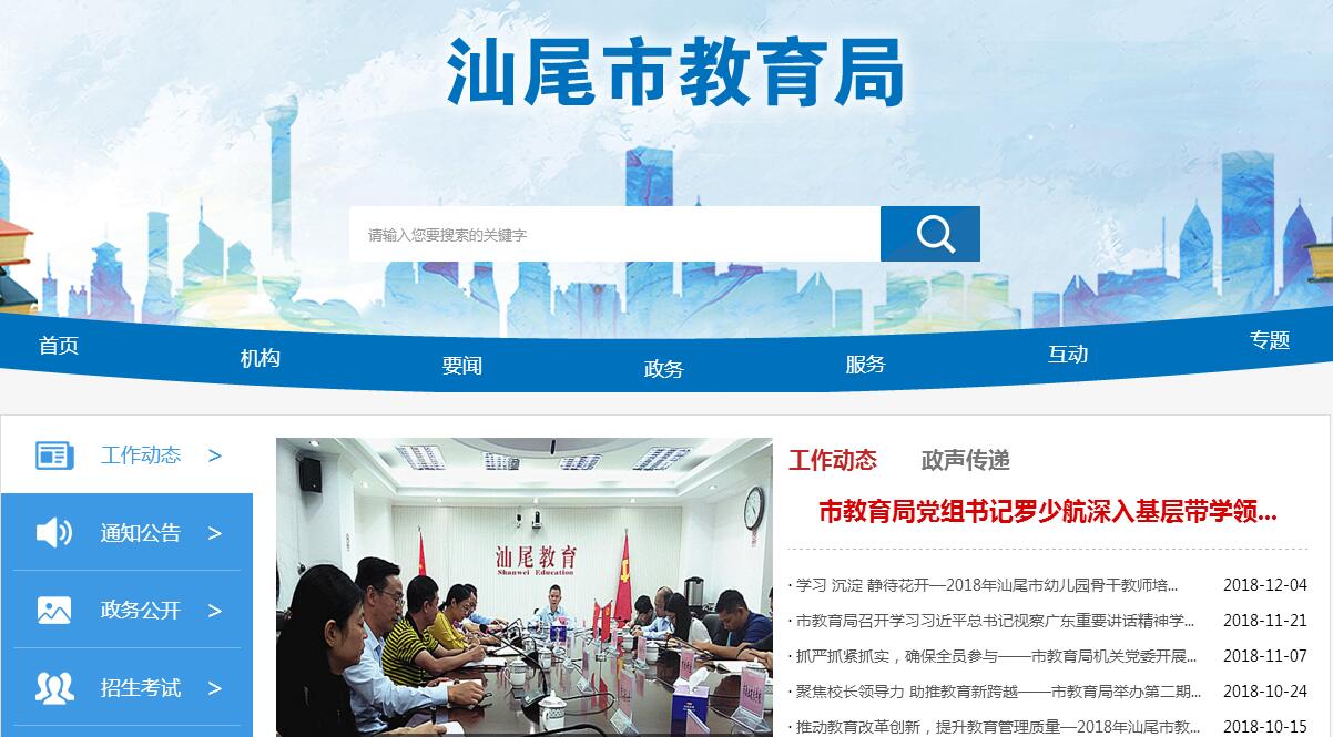 汕尾市教育局主要职责:一、贯彻执行党和国家的教育方针、政策和法规,研究草拟地方性教育规章制度,并组织实施。二、研究制订全市的教育事业发展规划,指导各级各类学校的布局调整和规划,制订年度发展指导性计划,并监督实施。协调、指导实施工作。负责普通及成人高等中等专业学校招生考试、自学考试和高中学业水平考试、初中升高中考试和普通及成人高等学校、高中阶段学校招生等管理工作。三、综合管理高等教育、中等职业教育、基础教育、职业教育与成人教育工作;负责指导各级各类学校的德育、体育、卫生、艺术、国防、民族、科技、禁毒、安全、法制等专题性教育;规划、指导、协调全市各级各类学校开展教学研究、教学改革和推进教育科研的成果转化工作;指导办学体制和学校内部管理体制的改革;指导教育管理数据的统计工作;指导各类学校学生学籍管理工作;指导和管理各学校的电化教育、信息化教育工作;指导、协调大中专师范类毕业生就业工作。四、监督各地教育财政拨款的执行和使用情况;会同有关部门拟订全市教育经费筹措、拨款、基础设施投入、教育收费、教育投资的有关规定;指导学校的基本建设;管理市级教育经费;对市属有关学校的经济活动进行审计监督。五、监督检查各地对教育法律法规、方针政策的执行情况;督导检查下级人民政府及有关职能部门履行教育职责和巩固提高“两基”工作;督导、评估办学水平和教育质量。六、统筹管理社会力量举办的各类高等、中等专业教育、职业技术教育、基础教育和教师继续教育等工作。七、规划和指导各级各类学校教师和教育行政干部队伍的建设工作;指导教育系统人事制度改革等工作;负责教师继续教育工作和教师评先评优表彰工作;指导实施各级各类教师资格制度;负责教师职称评审和资格认定的相关工作。八、承担市语言文字工作委员会的日常工作。九、管理局直属事业单位,负责市属学校管理工作,指导市属学校党的建设工作;协调有关部门做好学校的统战和社团组织工作;指导教育系统的纪检监察、安全保卫和维护稳定工作。十、会同有关部门管理本系统的对外交流与对外合作,以及港、澳、台地区的教育交流工作。十一、承办市人民政府和省教育厅交办的其他工作。