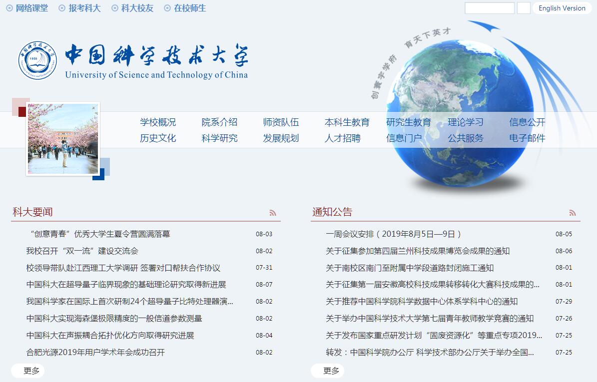 中国科学技术大学是中国科学院所属的一所以前沿科学和高新技术为主,兼有特色管理和人文学科的综合性全国重点大学。1958年9月创建于北京,首任校长由郭沫若兼任。她的创办被称为“我国教育史和科学史上的一项重大事件”。建校后,中国科学院实施“全院办校,所系结合”的办学方针,学校紧紧围绕国家急需的新兴科技领域设置系科专业,创造性地把理科与工科即前沿科学与高新技术相结合,注重基础课教学,高起点、宽口径培养新兴、边缘、交叉学科的尖端科技人才,汇集了严济慈、华罗庚、钱学森、赵忠尧、郭永怀、赵九章、贝时璋等一批国内最有声望的科学家,建校第二年即被列为全国重点大学。1970年初,学校迁至安徽省合肥市,开始了第二次创业。1978年以后,学校锐意改革、大胆创新,在全国率先提出并实施了一系列具有创新精神和前瞻意识的教育改革措施,创办少年班、首建研究生院、建设国家大科学工程、面向世界开放办学等,使学校得以恢复并迅速发展。学校是国家首批实施“985工程”和“211工程”的大学之一,也是唯一参与国家知识创新工程的大学。长期以来,学校始终坚持“全院办校、所系结合”的办学方针,弘扬“红专并进,理实交融”的校风,形成了不断开拓创新的优良传统,以及教学与科研相结合、理论与实践相结合的鲜明特色,培养了一大批德才兼备的高层次优秀人才。学校面向世界科学前沿领域和国家重大需求,凝练科学目标,开展科学研究,努力提高学术研究水平和科研创新能力与科研竞争力,取得了一批具有世界领先水平的原创性科技成果。在新的历史起点上,学校加快建设具有中国特色、科大风格的世界一流大学,在国家“双一流”建设中,入选A类世界一流大学建设高校。学校现有20个学院(含6个科教融合共建学院)、31个系,设有研究生院,以及苏州研究院、上海研究院、北京研究院、先进技术研究院、中国科学技术大学附属第一医院(安徽省立医院)等。有数学、物理学、力学、天文学、生物科学、化学共6个国家理科基础科学研究和教学人才培养基地和1个国家生命科学与技术人才培养基地,8个一级学科国家重点学科,4个二级学科国家重点学科,2个国家重点培育学科,18个安徽省一级学科重点学科。建有国家同步辐射实验室、合肥微尺度物质科学国家研究中心、火灾科学国家重点实验室、核探测与核电子学国家重点实验室、类脑智能技术与应用国家工程实验室、语音及语言信息处理国家工程实验室、量子信息与量子科技前沿协同创新中心、国家高性能计算中心(合肥)、安徽蒙城地球物理国家野外科学观测研究站等12个国家级科研机构、4个国家重点科技基础设施和55个院省部级重点科研机构。目前,全校上下正深化改革,锐意创新,以习近平新时代中国特色社会主义思想为指导,力争把学校建设成为具有科研机构深度融合,创新人才和创新成果不断涌现,具有中国特色的世界一流大学,为实现“创寰宇学府,育天下英才”的宏伟目标而努力奋斗。