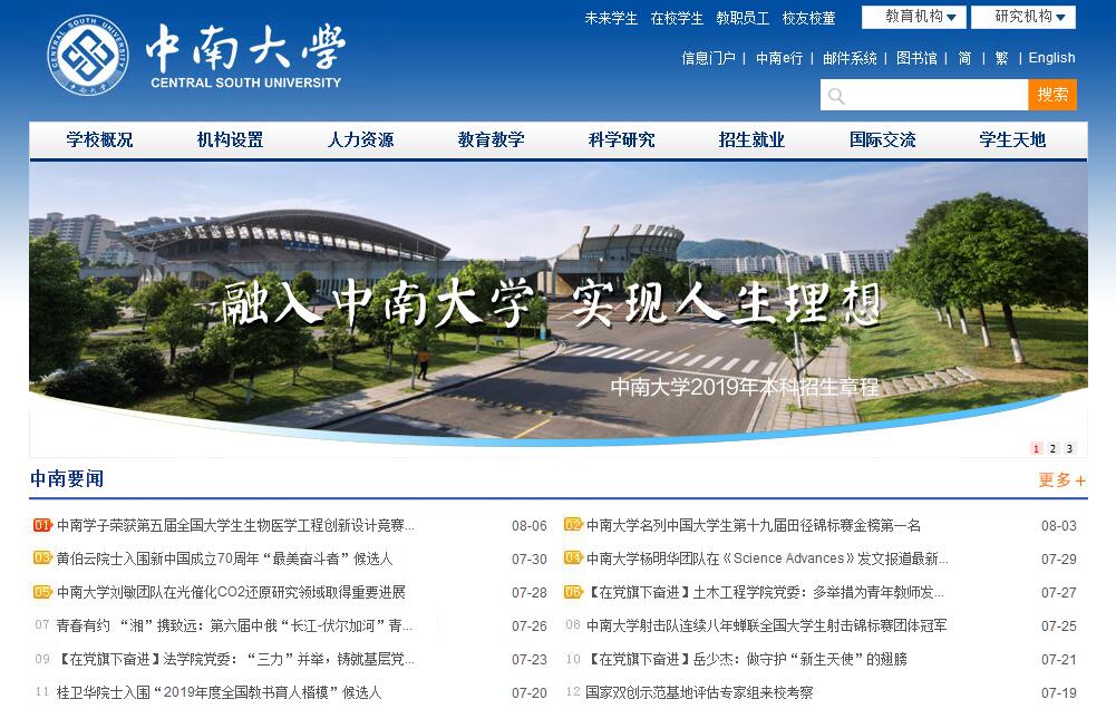 中南大学坐落在中国历史文化名城──湖南省长沙市,占地面积5886亩,建筑面积276万平方米,跨湘江两岸,依巍巍岳麓,临滔滔湘水,环境幽雅,景色宜人,是求知治学的理想园地。中南大学是教育部直属全国重点大学、国家“211工程”首批重点建设高校、国家“985工程”部省重点共建高水平大学和国家“2011计划”首批牵头高校,2017年9月经国务院批准入选世界一流大学A类建设高校。现任校党委书记易红、校长田红旗。中南大学由原湖南医科大学、长沙铁道学院与中南工业大学于2000年4月合并组建而成。原中南工业大学的前身为创建于1952年的中南矿冶学院,原长沙铁道学院的前身为创建于1953年的中南土木建筑学院,两校的主体学科最早溯源于1903年创办的湖南高等实业学堂的矿科和路科。原湖南医科大学的前身为1914年创建的湘雅医学专门学校,是我国创办最早的西医高等学校之一。中南大学秉承百年办学积淀,顺应中国高等教育体制改革大势,弘扬以“知行合一、经世致用”为核心的大学精神,力行“向善、求真、唯美、有容”的校风,坚持自身办学特色,服务国家和社会重大需求,团结奋进,改革创新,追求卓越,综合实力和整体水平大幅提升。学校学科门类齐全,拥有完备的有色金属、医学、轨道交通等学科体系,涵盖哲、经、法、教、文、理、工、医、管、艺等10大学科门类,辐射军事学。现有一级学科国家重点学科6个,二级学科国家重点学科12个,国家重点(培育)学科1个,国家临床重点专科61个;设有31个二级学院,104个本科专业;博士学位授权一级学科29个,硕士学位授权一级学科44个,博士专业学位授权类别2个,硕士专业学位授权类别21个,博士后科研流动站32个。材料科学、工程学、临床医学、化学、药理学与毒理学、生物学与生物化学、神经科学与行为学、数学、计算机科学、分子生物学与遗传学、社会科学总论、免疫学、精神病学与心理学等13个学科ESI(基本科学指标)排名居全球前1%,其中材料科学排名居全球前1‰;拥有享“南湘雅”美誉的湘雅医院、湘雅二医院、湘雅三医院3所大型三级甲等综合性医院及湘雅口腔医院,湘雅医学院附属肿瘤医院、海口医院、株洲医院。学校坚持人才强校战略,师资力量雄厚。有中国科学院院士2人,中国工程院院士14人,国家“千人计划”入选者57人,国家“万人计划”领军人才12人,“973计划”项目首席科学家19人(其中青年项目2人),“长江学者奖励计划”特聘、讲座教授46人,国家教学名师7人,教授及相应正高职称人员1500余人,享受政府特殊津贴专家496人。学校坚持立德树人,质量优先,努力探索和完善人才培养新模式。现有全日制在校学生5.5万余名,其中本科生3.4万余人、研究生2万余人、留学生近千人。先后获得国家精品课程57门,国家教学团队8个,国家级实验教学示范中心8个。在国内率先创办创新型高级工程人才实验班,成为教育部卓越工程师、卓越医师、卓越法律人才教育培养计划试点高校。学校是全国首批试点开展八年制医学教育(医学博士学位)的大学之一,也是全国第一所为军队培养现役军官指技合一硕士研究生的高校。学校入选全国首批毕业生就业典型经验高校、全国大众创业万众创新示范基地,成为我国百强企业最欢迎的10所大学之一。学校坚持瞄准国家和社会重大需求,深入推进协同创新,积极服务国民经济建设和国防现代化建设主战场。学校现有国家级创新平台20个,其中国家重点实验室2个、国家工程研究中心4个、国家工程技术研究中心2个、国家工程实验室5个、国防科技重点实验室1个、国家工程化与创新能力建设平台1个、国家临床医学研究中心3个,牵头和参与组建国家“2011协同创新中心”2个。2000年以来,学校共获国家科技三大奖86项,其中获国家科技一等奖(特等奖)14项,9个项目入选“中国高校十大科技进展”。学校坚持开放办学,国际合作与交流活跃,先后与美、英、澳、加、日、法、德、俄等20多个国家和地区的200多所大学和科研机构建立了长期合作关系,与众多跨国企业集团广泛开展产学研合作。现有来自100多个国家和地区的留学生在校学习。学校始终坚持党委领导下的校长负责制,牢牢把握正确办学方向,全面提升学校党建与思想政治工作科学化水平,为改革发展稳定提供坚强的思想、政治和组织保证。学校先后被评为全国党的建设和思想政治工作先进高校、全国精神文明建设工作先进单位、全国基层思想政治工作先进典型单位。学校的建设和发展得到了党和国家领导人的亲切关怀和充分肯定。近年来,习近平总书记等9位中央政治局常委在内的20余位党和国家领导人相继来校视察,对学校的改革创新、人才培养、科学研究、社会服务等各项工作给予高度评价。“惟楚有材,于斯为盛”,今天的中南大学正肩负着国家高水平大学建设的历史责任,立足湖南,面向全国,放眼世界,加快推进校内综合改革和内涵式发展,努力建设特色鲜明的世界一流大学,为实现中华民族伟大复兴的中国梦做出更大贡献!