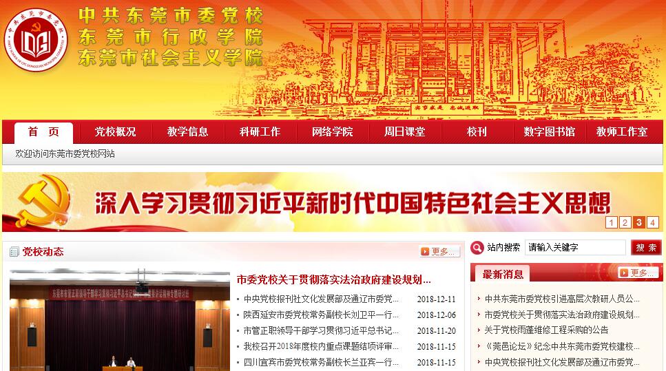 中共东莞市委党校新校区位于水濂山生态公园与市植物园(绿色世界)之间,总占地积近150亩。基础设施配套齐全,分为办公区、教学区和生活区三个部分,可同时容纳约550人在校住宿培训。主要建筑包括:行政楼1栋、图书馆1栋、教学楼2栋、学员楼6栋、餐厅、球场等,教学楼有教室12间、阶梯教室2间、情景模拟实训室2间、研讨室18间、多功能中心会议室1个以及报告厅3个。其中,图书馆面积5000平方米,现有藏书共计82000多册,涵盖了党建、政治、哲学、法学、管理、经济、国学、文学、艺术、计算机等学科门类,订有数十份报纸、一百二十多种刊物,形成了涉及多个学科门类、体现党校特色的藏书体系。现为东莞图书馆分馆,可共享东莞图书馆馆藏图书和数字资源。为适应东莞高水平崛起的新情况新要求,新校区内实现了网络全覆盖并配备齐全的电教设备,同时通过实施“教学品牌”、“科研精品”、“人才强校”、“优化服务管理”、“校园文化”以及“党建科学化”等六大工程,努力打造全国一流地市级党校,为学员提供一个教研质量高、党味浓厚、设备现代化、服务管理一流的学习和生活环境。据《关于印发中共东莞市委党校(东莞市行政学院、东莞市社会主义学院)机构编制方案的通知》(东机编〔2012〕97号)精神,我校(院)主要职能是:(一)研究、宣传马克思主义、毛泽东思想、邓小平理论、“三个代表”重要思想、科学发展观和习近平新时代中国特色社会主义思想,宣传中国特色社会主义理论和党的路线、方针、政策。(二)负责处级领导干部、镇街领导干部、科级干部、中青年领导干部、村(社区)“两委”干部的培训轮训工作;培训意识形态部门的领导干部和理论骨干;承担公务员和参照公务员制度管理人员的培训轮训工作;承担民主党派和无党派人士的政治培训工作;协助组织人事部门对学员在校期间进行考察考核工作。(三)按照国家的规定和上级党校的部署,承担部分学历教育、成人高等教育以及党政干部继续教育。(四)围绕国内外,特别是我市经济社会发展的新情况、新问题,结合市委、市政府的中心任务,开展调查研究,为市委、市政府和有关部门提供决策参考与咨询,认真办好《莞邑论坛》校刊。(五)对党员、干部的教育情况与培训需求进行调查了解,向市委、市政府提出合理化建议。(六)对基层党校执行党校教育方针、政策情况进行调查了解,提出意见和建议,指导帮助其师资培训和提高教学科研水平;送理论下乡,为基层培训提供服务。(七)承办市委、市政府和上级党校交办的其他事项。