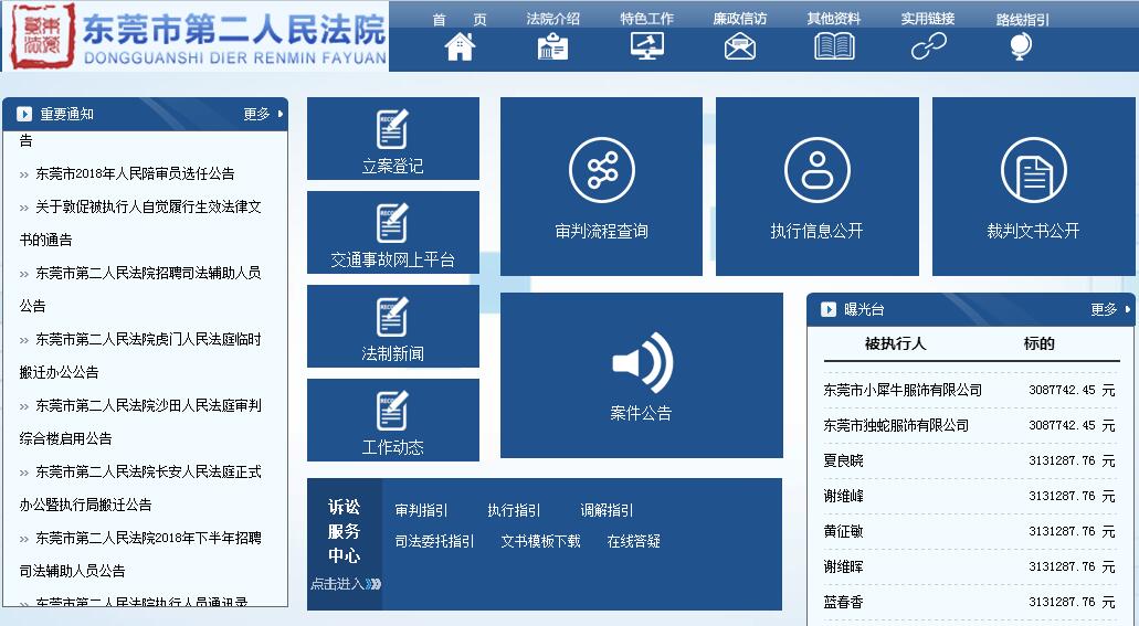 东莞市第二人民法院是全省优秀法院、全国法院文化建设示范单位、全国多元化纠纷解决机制改革示范法院、全国司法公开示范法院、全国家事审判方式和工作机制改革试点工作法院。下设虎门、厚街、沙田、大朗、大岭山5个派出法庭。截至2017年年底,我院共有工作人员429人,其中公务员183人(含员额法官91人)。2017年结案34666件,法官年人均结案381件,是全省法官人均结案数的1.55倍。我院“院庭长办案常态化 让优质审判资源回到审判一线”改革项目成功入选《人民法院司法改革案例选编(一)》,成为东莞市唯一入选的改革案例,也是广东法院三个典型案例之一。刑庭审理的被告人利惠青等容留他人吸毒案入选全国毒品犯罪及涉毒次生犯罪十大典型案例。这一年,我院认真学习贯彻落实党的十九大精神。制定下发学习宣传贯彻党的十九大精神工作方案和实施意见,要求全体同志把学习成效真正体现在指导审判实践、推动法院发展上,认真办好每一宗案件,让人民群众在每一个司法案件中感受到公平正义。这一年,我院大力推进繁简分流工作。发布实施《关于民商事案件调解操作规程》,建立了调解前置制度,规范调审衔接,明确诉讼费杠杆制度促进调解。加强专业调解队伍建设,建立调解员晋升机制,调动调解员积极性。多元纠纷解决机制探索取得新进展,受邀参加最高法院在安徽召开的深入推进多元化纠纷解决机制改革暨示范法院经验交流会并做典型发言。这一年,我院积极推进审判工作改革。推进以审判为中心的刑事诉讼制度改革,严格落实排除非法证据的新规定,推进鉴定人、证人出庭制度。与东莞市妇联联合出台《东莞市妇联和东莞市第二人民法院深化家事案件调解合作方案》,在形成专业的家事调解员培训课程、建立实用的社工陪同制度等方面加强合作,同时完善特色家事审判环境,共同推动促进家事纠纷和谐解决。发布《网络司法拍卖操作规定》,对拍卖平台、适用范围、职责分工、拍卖流程作出明确规定,2017年网络司法拍卖成交483件,成交金额达7.1亿元。专门成立破产审判(执行裁判)合议庭,负责审理破产案件以及执行异议、执行异议之诉,积极服务经济转型升级。这一年,我院不断丰富司法为民举措。开通通过微信、支付宝、网上支付平台通过扫二维码缴纳诉讼费系统,方便群众诉讼。完善网上预约立案服务,网上立案审查结果会通过短信方式即时发送到申请人手机。开发上线交通事故人伤计算器,协助当事人评估事故损失,建立合理的赔偿预期。2018年,我院将全面贯彻党的十九大精神,以习近平新时代中国特色社会主义思想为指导,深入贯彻习近平总书记对广东重要指示批示精神,增强“四个意识”,坚定“四个自信”,紧紧围绕“让人民群众在每一个司法案件中感受到公平正义”目标,在服务大局中充分发挥审判职能作用,奋力开创新时代法院改革发展新局面。