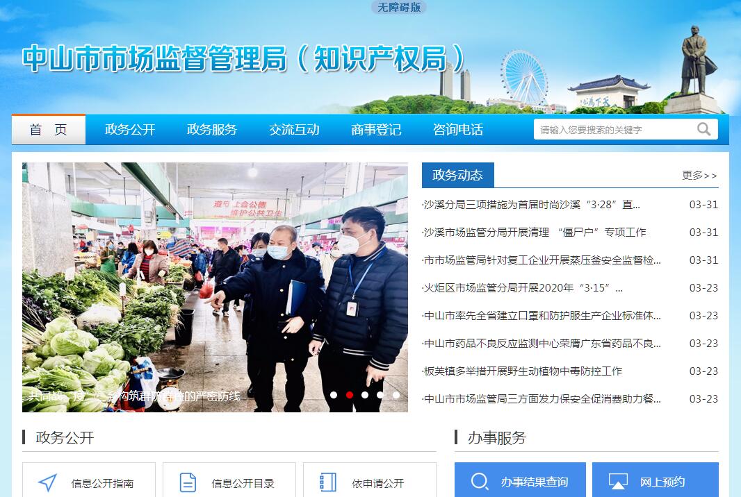 中山市市场监督管理局主要职责:(一)负责市场综合监督管理和知识产权管理。起草市场监督管理和知识产权有关规范性文件草案,制定有关政策、标准,组织实施质量强市战略、食品安全战略、标准化战略和知识产权战略。拟订并组织实施有关规划,规范和维护市场秩序,营造诚实守信、公平竞争的市场环境。(二)负责市场主体统一登记注册与相关行政许可。组织指导全市各类企业、农民专业合作社和从事经营活动的单位、个体工商户以及外国(地区)企业常驻代表机构等市场主体的登记注册工作,以及依法由本部门实施的行政许可工作。建立市场主体信息公示和共享机制,依法公示和共享有关信息,加强信用监管,推动市场主体信用体系建设。(三)负责组织和指导市场监管、知识产权、物价、商务、粮食流通、教育、体育等领域综合执法工作。指导全市市场监管综合执法队伍建设,推动实行统一的市场监管。组织查处重大违法案件。规范市场监督管理行政执法行为。(四)负责监督管理市场秩序。依法监督管理市场交易、网络商品交易及有关服务的行为。组织指导查处价格收费违法违规、不正当竞争、违法直销、传销、侵犯商标专利知识产权和制售假冒伪劣行为。指导广告业发展,监督管理广告活动。负责全市市场监管相关安全生产工作。组织指导查处无照生产经营和相关无证生产经营行为。指导市消费者委员会开展消费维权工作。(五)负责反垄断执法调查工作。统筹推进竞争政策实施,组织指导实施公平竞争审查制度。依据委托开展垄断协议、滥用市场支配地位和滥用行政权力排除、限制竞争等反垄断执法调查工作。依据委托对经营者集中行为开展调查。指导企业在国外的反垄断应诉工作。(六)负责统一管理标准化工作。依法协调指导和监督地方标准、团体标准制修订工作。组织制定并实施标准化激励政策,规范标准化活动。(七)负责促进知识产权运用。拟订并实施知识产权激励奖励制度、知识产权转化运用和交易运营政策措施。指导落实商标、专利、原产地地理标志申请的审查、确权相关前置服务工作。指导知识产权无形资产评估、审查评议工作。指导和促进知识产权服务业发展。统筹指导知识产权公共服务体系建设,推动知识产权信息传播利用。(八)负责保护知识产权。拟订并实施严格保护商标、专利、原产地地理标志等知识产权制度措施。研究提出知识产权保护体系建设方案并组织实施,推动建设知识产权保护体系。负责组织指导商标、专利执法工作,组织指导知识产权争议处理、维权援助和纠纷调处。组织指导知识产权预警和涉外保护工作。拟订并实施鼓励新领域、新业态、新模式创新的知识产权保护、管理和服务政策。(九)负责宏观质量管理。拟订并实施全市质量发展的制度措施。统筹全市质量基础设施建设与应用,会同有关部门推行重大工程设备质量监理制度,开展产品质量事故调查,实施缺陷产品召回制度。(十)负责产品质量安全监督管理。组织实施产品质量监督抽查、风险监控和伤害监测工作。组织实施质量分级制度、质量安全追溯制度。负责纤维质量监督工作。实施工业产品生产许可管理。(十一)负责食品安全监督管理综合协调。统筹指导全市食品安全工作。负责食品安全应急体系建设,组织指导实施食品安全事件应急处置和调查处理工作。建立健全食品安全重要信息直报制度。承担市食品安全委员会日常工作。(十二)负责食品安全监督管理。建立覆盖食品生产、流通、消费全过程的监督检查制度和隐患排查治理机制并组织实施,防范区域性、系统性食品安全风险。推动建立食品生产经营者落实主体责任的机制,健全食品安全追溯体系。组织开展食品安全监督抽检、风险监测研判、核查处置和风险预警、风险交流工作。依法组织实施特殊食品监督管理。(十三)负责特种设备安全监督管理。综合管理特种设备安全监察、监督、风险防范和伤害监测工作,监督检查高耗能特种设备节能标准的执行情况。依法承担特种设备安全事故调查工作。(十四)负责统一管理计量工作。执行国家计量制度,推行法定计量单位,依职责管理计量器具及量值传递和比对工作。规范、监督商品量和市场计量行为。(十五)负责统一管理认证认可和检验检测工作。拟订并实施认证认可与检验检测监督管理的制度措施。推进检验检测机构改革。指导协调全市认证认可与检验检测行业发展。依法监督管理认证认可与检验检测工作。(十六)负责药品、医疗器械、化妆品经营和使用环节质量安全监督管理。组织实施药品、医疗器械和化妆品分类管理制度。配合实施国家基本药物制度。组织开展药品不良反应、医疗器械不良事件和化妆品不良反应监测工作。组织开展药品、医疗器械、化妆品安全监督抽检工作。负责药品零售、医疗器械经营的许可、检查和处罚,以及化妆品经营、药品和医疗器械使用环节质量的检查和处罚。(十七)负责市场监督管理、知识产权领域科技和信息化建设、新闻宣传、交流与合作。参与开展相关工作对外谈判。按规定承担技术性贸易措施有关工作。(十八)完成市委、市政府和上级业务主管部门交办的其他任务。
