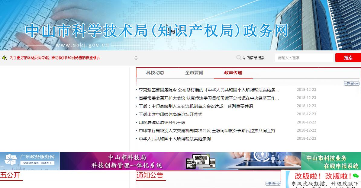 中山市科学技术局主要职责是:(一)贯彻执行国家和省、市有关科学技术和专利工作的方针政策和法律法规,拟订地方性政策措施并组织实施。(二)会同有关部门提出全市科技发展重大布局、优先领域政策性建议,编制和实施全市中长期科技发展规划和年度计划,牵头组织经济社会发展重要领域的重大关键技术、共性技术攻关,组织申报省级以上各类科技计划,组织实施市级科技发展资金的各类计划项目。(三)会同有关部门组织科技重大专项实施中的方案论证、综合平衡、评估验收和制定相关配套政策,对科技重大专项实施中的重大调整提出意见。(四)承担推进全市创新体系建设的责任。会同有关部门编制全市创新体系建设规划,拟订促进全市知识创新、技术创新的政策措施,制定科研条件保障规划和提出相关政策,推进科技基础条件平台、实验室体系和重点科研基地、产业创新平台、重大创新基地建设和科技资源共享,拟订科技促进企业自主创新的政策措施,会同有关部门组织申报创新型企业和自主创新产品,推动企业自主创新能力建设。(五)会同有关部门拟订高新技术及其产业化政策,指导高新技术产业化及应用技术的开发与推广,会同有关部门组织申报高新技术企业和高新技术产品,指导高新技术产业开发区、各类科技示范推广基地的建设,促进科技型中小企业的技术创新工作。(六)牵头拟订促进产学研结合的相关政策,组织实施深化产学研合作行动计划,会同有关部门制定科技成果推广政策,指导科技成果转化工作,组织相关重大科技成果应用示范。(七)组织拟订科技促进农业和农村发展的政策措施,会同有关部门推进农村信息直通车工程和专业镇科技创新示范点建设,促进以改善民生为重点的农村建设和社会建设。(八)拟订科技服务业发展的政策和规划,拟订促进技术市场、科技中介组织发展的政策措施,负责技术市场、科技中介组织的指导和监督管理;制定科普规划和政策,推动科普工作发展;负责科技评估、科技进步考核和科技统计管理;推进民营科技工作;会同有关部门推进科技金融结合工作;拟订科技合作与交流的政策措施;负责市国防科技装备动员相关工作。(九)负责本部门科技经费预决算及经费使用的监督管理,会同有关部门提出科技投入及优化科技资源配置的重大政策和措施建议。(十)负责科学技术奖评审的组织工作,会同有关部门拟订科技人才队伍建设规划,提出相关政策建议。(十一)推动知识产权创造、运用、保护和管理体系建设,统筹、协调、指导知识产权战略的实施工作;负责全市专利行政执法及市场规范和管理工作,依法处理和调解专利纠纷、查处专利违法行为;负责全市专利工作,贯彻落实专利优惠、奖励政策和措施,指导、协调企事业单位专利工作。(十二)指导、协调市直部门和各镇区的科技、专利工作。(十三)承办上级交办的其他事项。