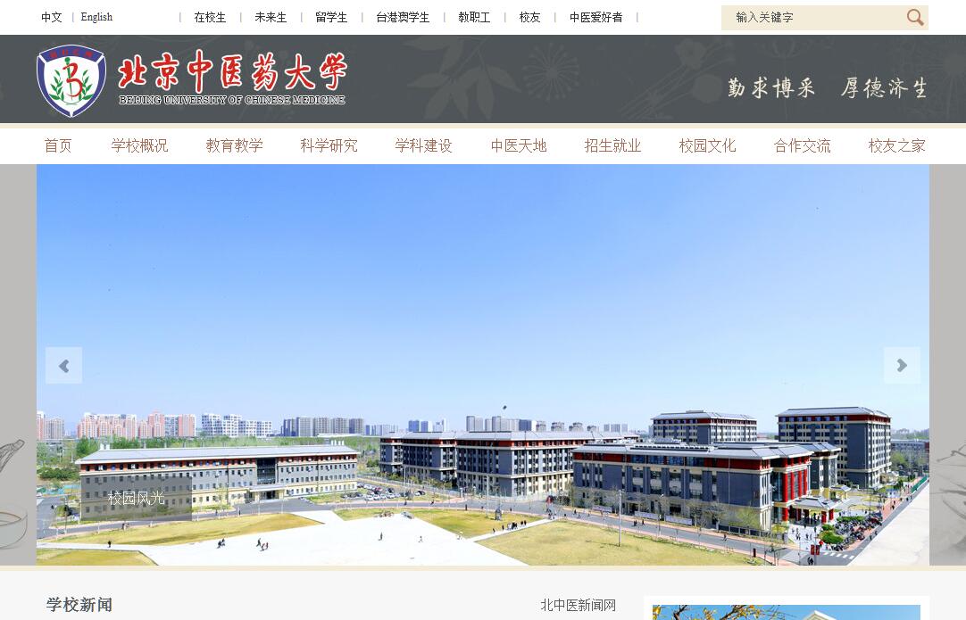 北京中医药大学是一所以中医药学为主干学科的全国重点大学,是唯一进入国家“211工程”建设的高等中医药院校,是国家“985优势学科创新平台”建设高校,是国家一流学科建设高校,直属教育部管理,由教育部、国家卫生健康委员会、国家中医药管理局和北京市共建。学校现任党委书记谷晓红,校长徐安龙。北京中医药大学始建于1956年,前身为北京中医学院,是国务院批准最早创办的高等中医药院校。1960年,被中央确定为全国重点高校;1971年,与中国中医研究院合并;1977年,两院分开,恢复独立办学;1993年,更名为北京中医药大学;1996年,入选国家“211工程”重点建设大学;2000年,与北京针灸骨伤学院合并,组建新的北京中医药大学;2011年,入选国家“985工程优势学科创新平台”建设高校;2017年,中医学、中西医结合、中药学3个学科入选国家“双一流”建设学科名单。学校现有3个校区,分别为和平街校区、望京校区和良乡校区。在长期的办学实践中,学校秉承“勤求博采、厚德济生”校训,倡导“人心向学、传承创新”理念,坚持“立德树人、以文化人”宗旨,弘扬“追求卓越、止于至善”精神,彰显特色、强化优势,是我国培养高层次创新型中医药人才的教育基地、高等中医药教育改革的示范基地、中医药知识创新和技术创新的研究基地、防治重大疾病和疑难疾患的医疗基地、弘扬优秀传统文化的人文基地、推进中医药走向世界的国际交流基地,为人类健康事业发展和文明进步做出了重要贡献,已经成为在国内外享有盛誉的集教学、科研、医疗于一体的著名中医药高等学府。学校现有教职工5020人,专任教师1285人,其中具有高级专业技术职务者占66.3%,具有硕士以上学位者占85.45%,有博士生导师335名。学校有“国医大师”6人,全国名中医3人,“首都国医名师”33人,“长江学者”特聘教授3人,国家杰出青年科学基金获得者3人,优秀青年科学基金获得者1人,“973”项目首席科学家4人,“万人计划”科技创新领军人才4人,“万人计划”教学名师1人,第七届国务院学科评议组成员3人,百千万人才工程国家级人选7人,国家级有突出贡献中青年专家8人,中医药高等学校教学名师4人,享受政府特殊津贴专家130人,形成了一支以国内外著名专家学者和国内有影响的中青年教授为主的师资队伍。学校现有全日制在校生11644人,其中本、专科生7264人,硕士研究生3594人,博士研究生786人,台港澳学生508人,留学生537人。另有继续教育学生2467人,远程教育学生18155人,目前全校各类在校生达32266人。学校致力于构建面向未来以高层次教育为主的人才培养体系,目前设有中医学、中药学、中药制药、药学、针灸推拿学、康复治疗学、公共事业管理(卫生事业)、药事管理、信息管理与信息系统、护理学、英语(医学、中医药国际传播)、法学(医药卫生)12个本科专业。学校是全国高等中医药院校中首批建立博士学科点和博士后科研流动站的单位之一,设有中医学、中药学、中西医结合3个博士后科研流动站。中医学、中药学、中西医结合均具有一级学科博士学位授权,囊括42个二级学科博士学位授予点,并有45个硕士学位授予点。5个专业学位类别,下设14个领域,包括9个博士学位授权点,14个硕士学位授权点。学校现有一级学科国家重点学科2个,涵盖二级学科国家重点学科15个;国家中医药管理局重点学科48个;一级学科北京市重点学科2个,二级学科北京市重点学科8个。重点学科建设在全国中医药院校中保持领先地位。学校现有省部级以上科研基地48个,其中国家级国际科技合作基地2个;教育部重点实验室3个;教育部工程研究中心2个;高等学校学科创新引智基地2个;国家中医药管理局三级实验室14个;国家中医药管理局重点研究室11个;北京市重点实验室6个;北京市教委工程研究中心1个;北京市国际科技合作基地6个;北京中医药文化研究基地1个。学校现有东直门医院(第一临床医学院)、东方医院(第二临床医学院)、第三附属医院(第三临床医学院)、枣庄医院(第四临床医学院)、深圳医院(第五临床医学院)、房山医院(第六临床医学院)、孙思邈医院(第七临床医学院)、厦门医院(第八临床医学院)8所附属医院。另有广安门医院、西苑医院、望京医院、中日友好医院、北京中医医院等24个临床教学基地,承担着全校学生的临床教学、见习、实习工作。学校现有国家临床重点专科15个,国家中医药管理局重点专科35个。建设有国医大师传承工作室5个,全国中医学术流派和全国名老中医药专家传承工作室42个,北京中医药“薪火传承3+3工程”名医传承工作站37个。自建校之初,学校率先接收外国留学生,到目前已为94个国家和地区培养了2万余名中医药专门人才,并先后与30个国家和地区的118所知名大学和研究机构建立合作关系。先后开设我国首个全英文授课西医生学习中医博士、硕士学位项目,首个全英文授课中医学士学位项目。2016年,与西班牙巴塞罗那大学开展合作,推动中医硕士学位首次进入欧盟主流医学教育体系。学校于1991年在德国建立了北京中医药大学魁茨汀医院,开创了中国大学在海外办医院的先例。2012年,与日本学校法人兵库医科大学合作建立了中医药孔子学院。学校的国际化发展不断探索创新,开创了集医疗、教育、研究、文化传播为一体的海外中医中心模式,先后建立北京中医药大学澳大利亚中医中
